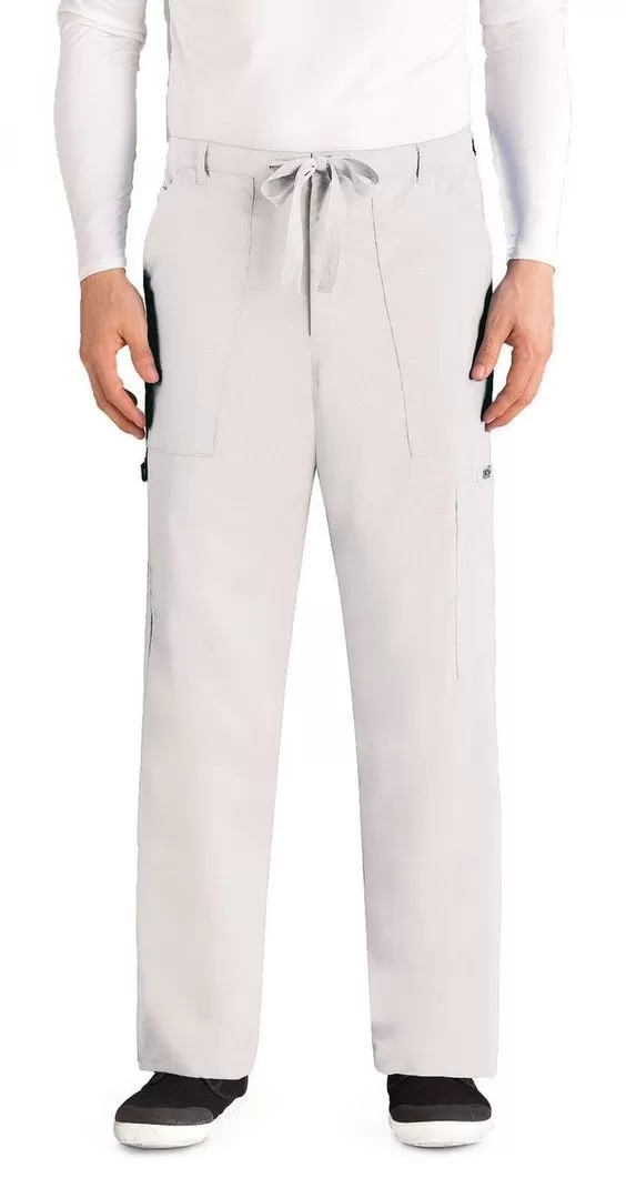 Стильные и удобные мужские брюки из комфортного тонкого материла. Отличаются эластичной талией со шнурком-завязкой и застежкой-пуговицей одновременно. Ширинка брюк на молнии. Модель имеет четыре накладных кармана, два передних, один задний и один боковой. Один из передних карманов дополнен внутренним отделением «для мелочи» и D-образным кольцом снаружи, которое может быть использовано для крепления бейджа. Боковой карман также функциональный, имеет отделенную швом секцию для ручки или карандаша и внутреннее отделение для мобильного телефона. К нему и пришит логотип бренда.