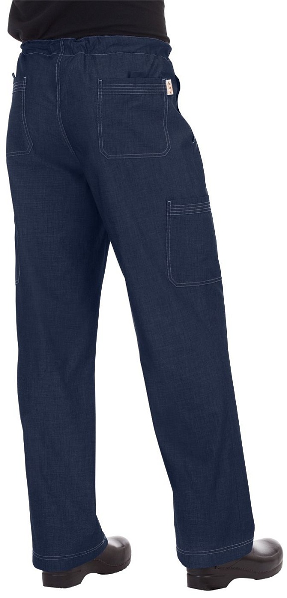 Оригинальные мужские брюки с джинсовой фактурой ткани и контрастной строчкой. Имеют эластичную талию с внешними завязками, ширинку на молнии и шесть карманов. Передние брючные карманы косой формы, задние и боковые - накладные. Некоторые из карманов застегиваются при помощи липучки.