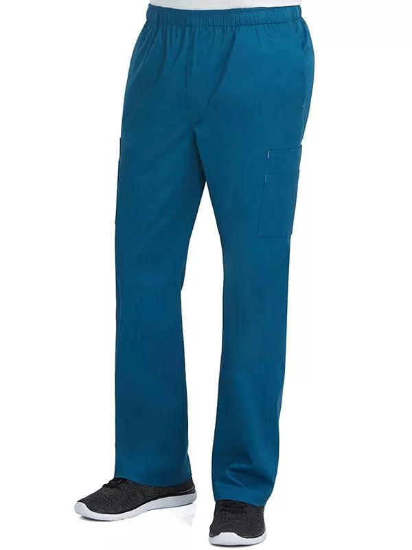Комфортные мужские брюки из эластичной ткани EZ-flex. Отличаются талией на резинке с внутренней кулиской, прямым свободным кроем и контрастной отделкой-вышивкой в области карманов. Их всего пять у данной модели: два брючных в боковых швах, два двойных боковых-cargo и один задний. Брючные карманы прорезные, а боковые задние - накладные. Несмотря на отсутствие застежки на поясе, имеется функциональная ширинка на молнии.