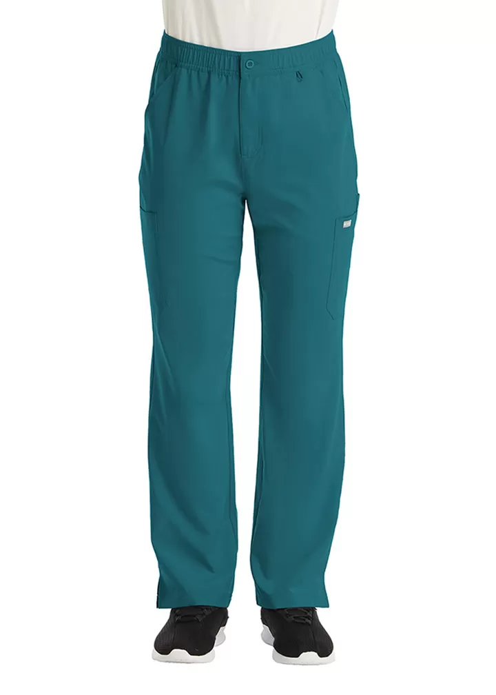 Удобные, слегка зауженные книзу, брюки с эластичным поясом. Ширинка застёгивается на молнию и стильную пуговицу, окрашенную в тон. Внутри пояса вшита кулиска, а плоский шнур украшен логотипом коллекции. Спереди расположены два косых кармана. Есть также два вместительных кармана-карго и накладных кармана сзади, оформленных в джинсовом стиле. В нижней части брючин по внешним сторонам есть вентиляционные разрезы. Все детали брюк, как по контуру, так и в местах соединения, прошиты прочным двойным стежком.