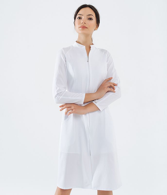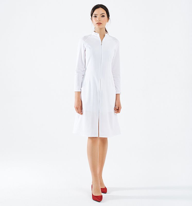 Халат приталенного силуэта, слегка расширенного книзу, из смесовой ткани. Состав ткани: 40% вискоза, 55% полиэстер, 5% лайкра. Воротник-стойка, расположенная по центру застежка на молнии, длинный рукав реглан. На полочках выполнены рельефы, переходящие в карманы. Спинка со средним швом и двумя талиевыми вытачками. Отделочная строчка расположена по воротнику стойки, по рельефам и пройме, по среднему шву спинки, по входу в карман. Полочка и спинка на подкладке.