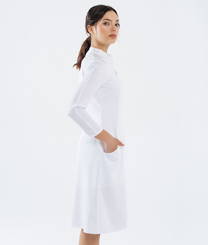Модель из ткани премиального качества, специализированной для профессиональной одежды. Легкий и очень приятный материал хорошо проводит воздух, устойчив к загрязнениям и запахам, прост в уходе. Ткань почти не мнется, хорошо драпируется, имеет красивую благородную фактуру с легким переливом.