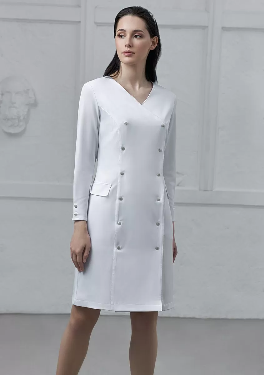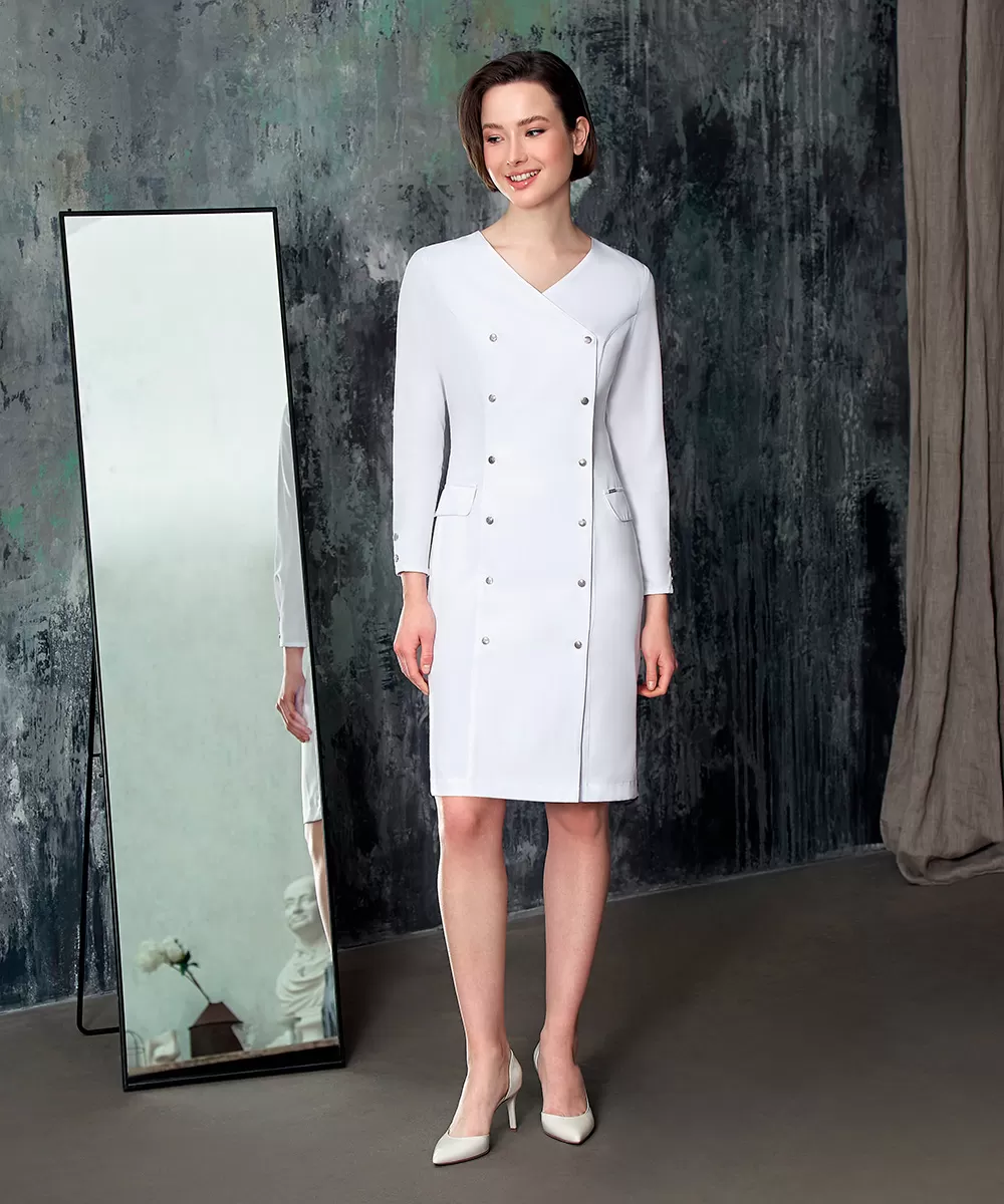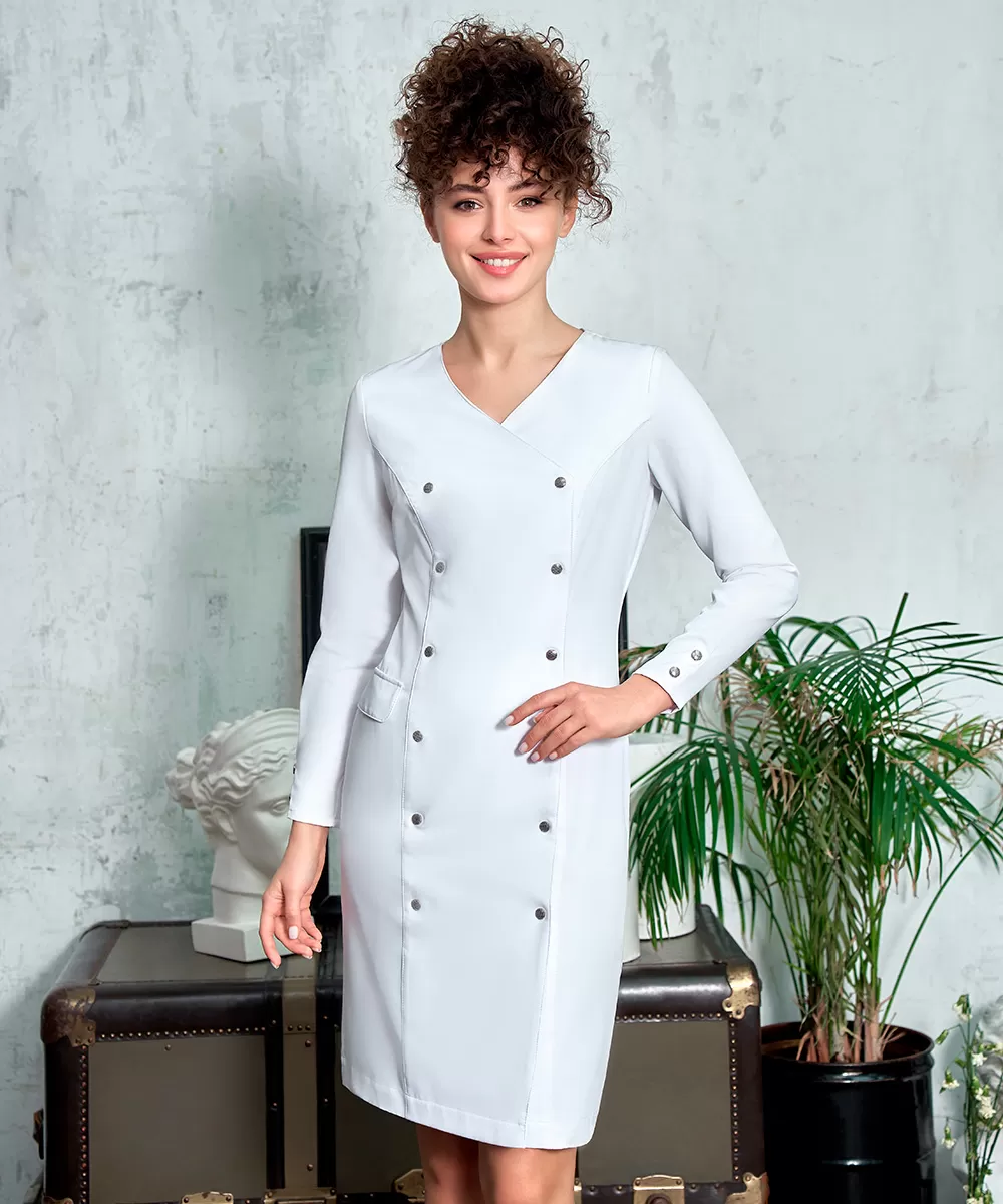 Двубортный халат вдохновлен актуальным кроем платьев-пиджаков.