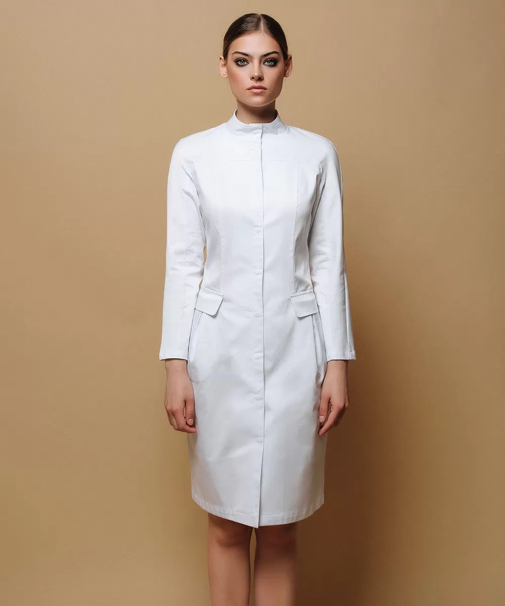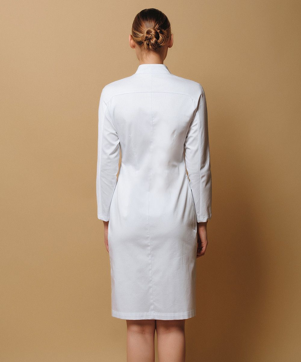Воротник-стойка, вертикальная центральная застежка на 7 потайных кнопок спереди и средний шов на спинке изделия поддерживаются рельефами полочки и талевыми вытачками на спинке.