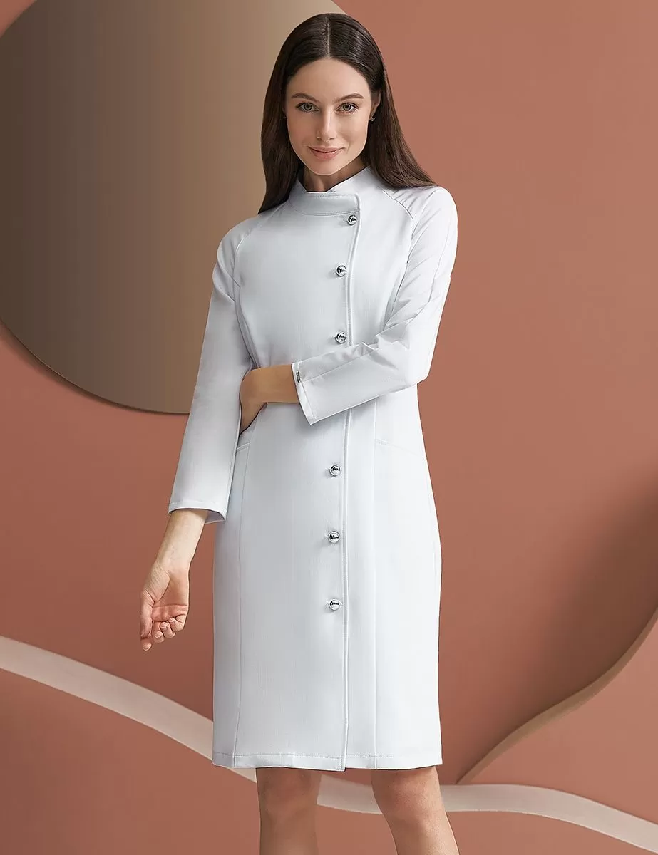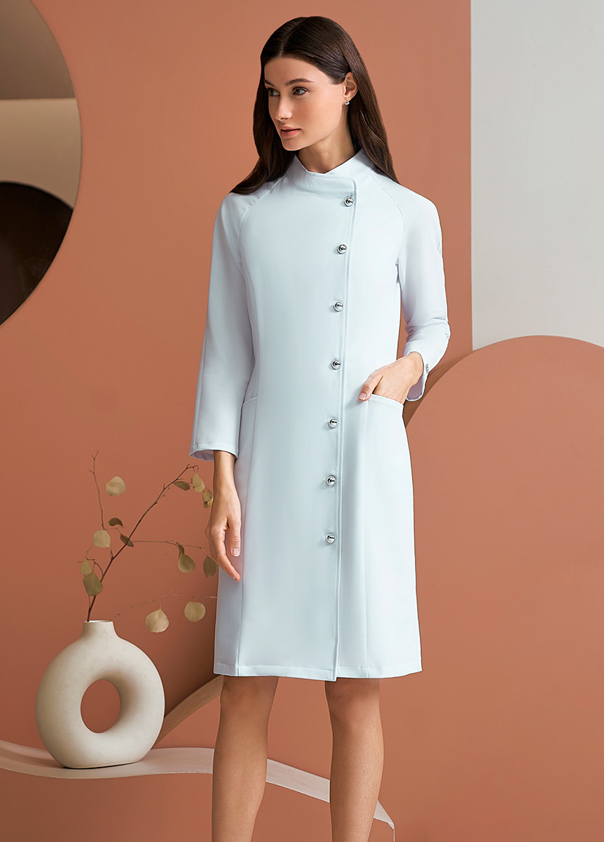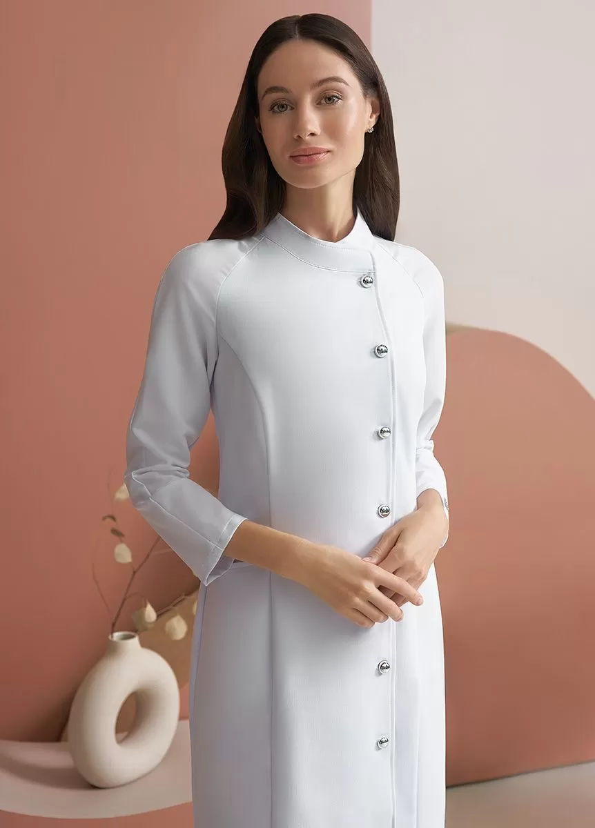 Халат прилегающего силуэта с рукавами реглан 7/8 и небольшим воротником-стойкой выполнен из приятной смесовой ткани на подкладе.