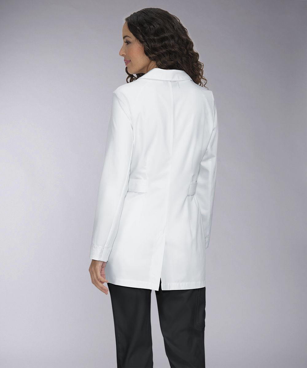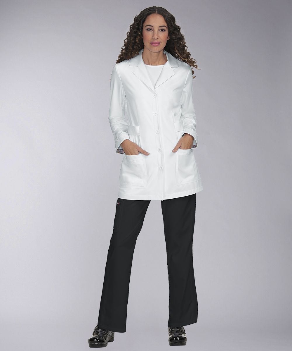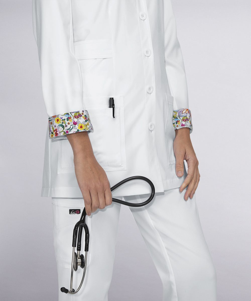 Медицинский халат Janice – это современный лабораторный халат, изготовленный из высококачественной эластичной ткани. Модель классического английского покроя: отложной зубчатый воротник, застёжка спереди на пуговицах, плечевые погоны-кокетки, вертикальные выточки на спинке и полочках. Дополняет силуэт элегантный декоративный пояс. Важная функциональная деталь – 3 накладных кармана, в которых вы сможете разместить всё необходимое. И, наконец, сюрприз от дизайнеров KOI – яркий цветочный принт на отворотах манжет и ворота.