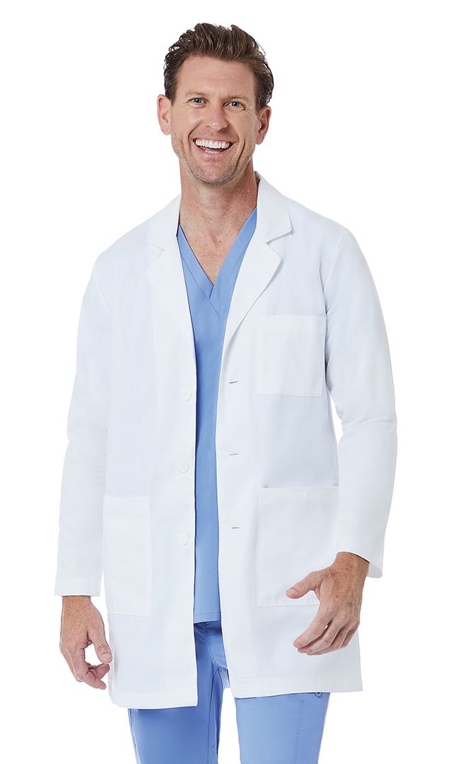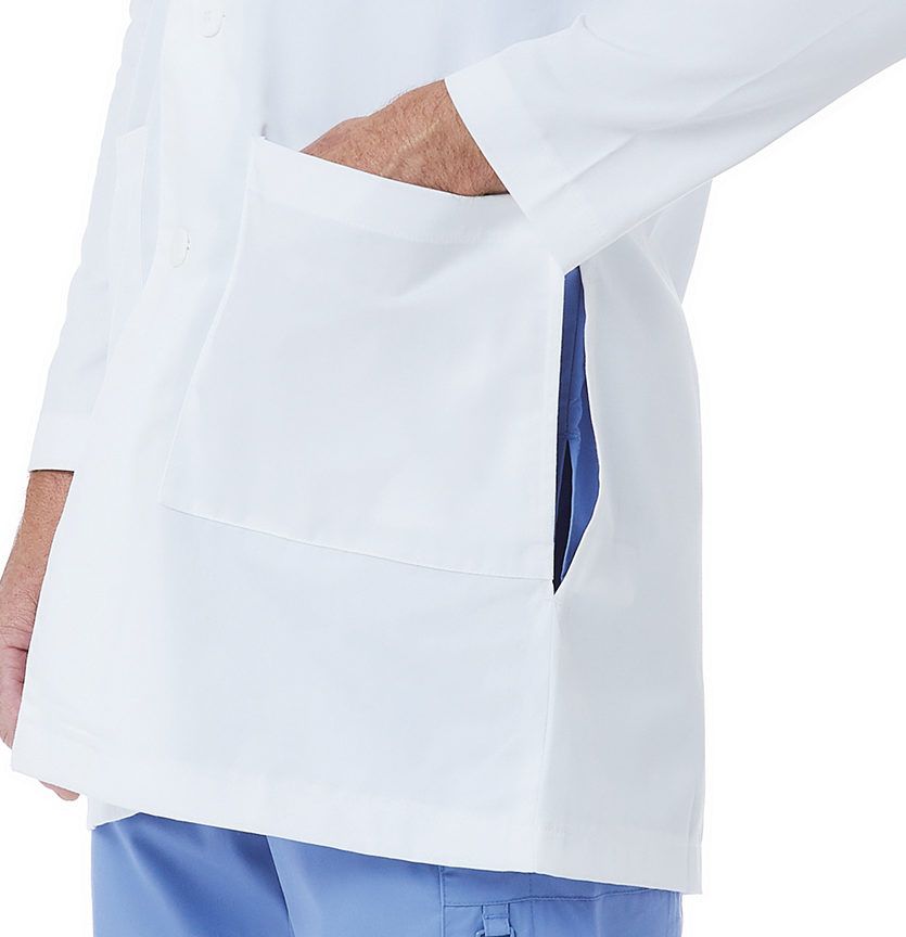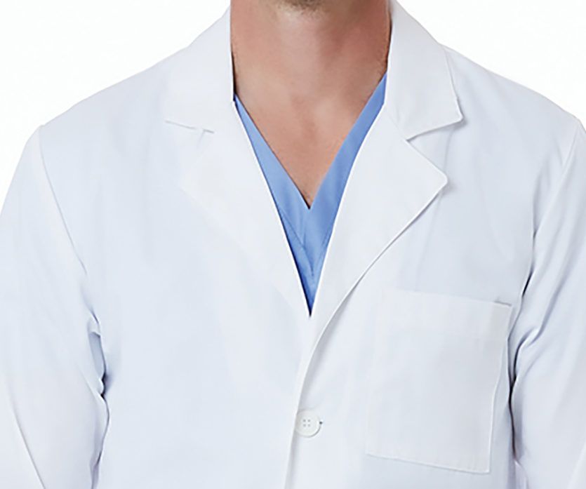 Классический лабораторный халат с английским зубчатым воротником, выполненный из первоклассного современного поликоттона. Этот прямой жакет средней длины застёгивается на три пуговицы в тон. Спинка на кокетке, разделена вертикальным швом со шлицей. Просторные рукава оканчиваются аккуратными манжетами. На полочках расположены три накладных кармана. По бокам есть прорези для удобного доступа к карманам брюк. Ткань гигиенична, очень проста в уходе и не теряет безупречную белизну даже после множества стирок.