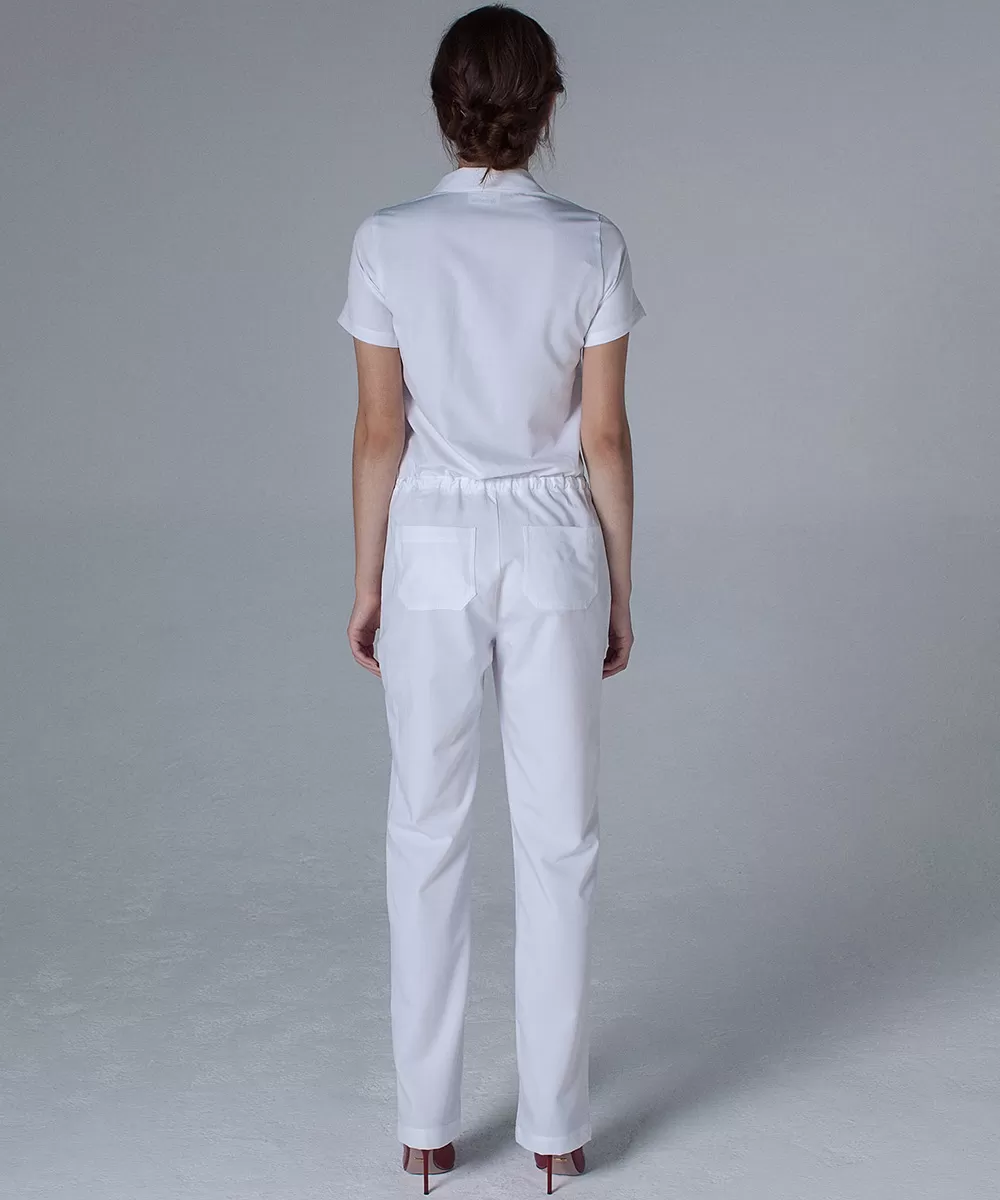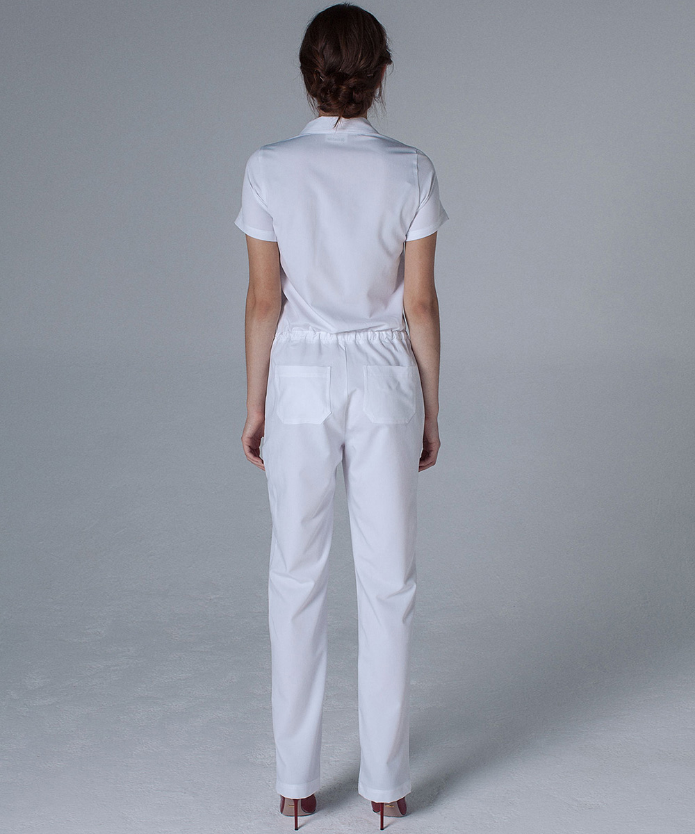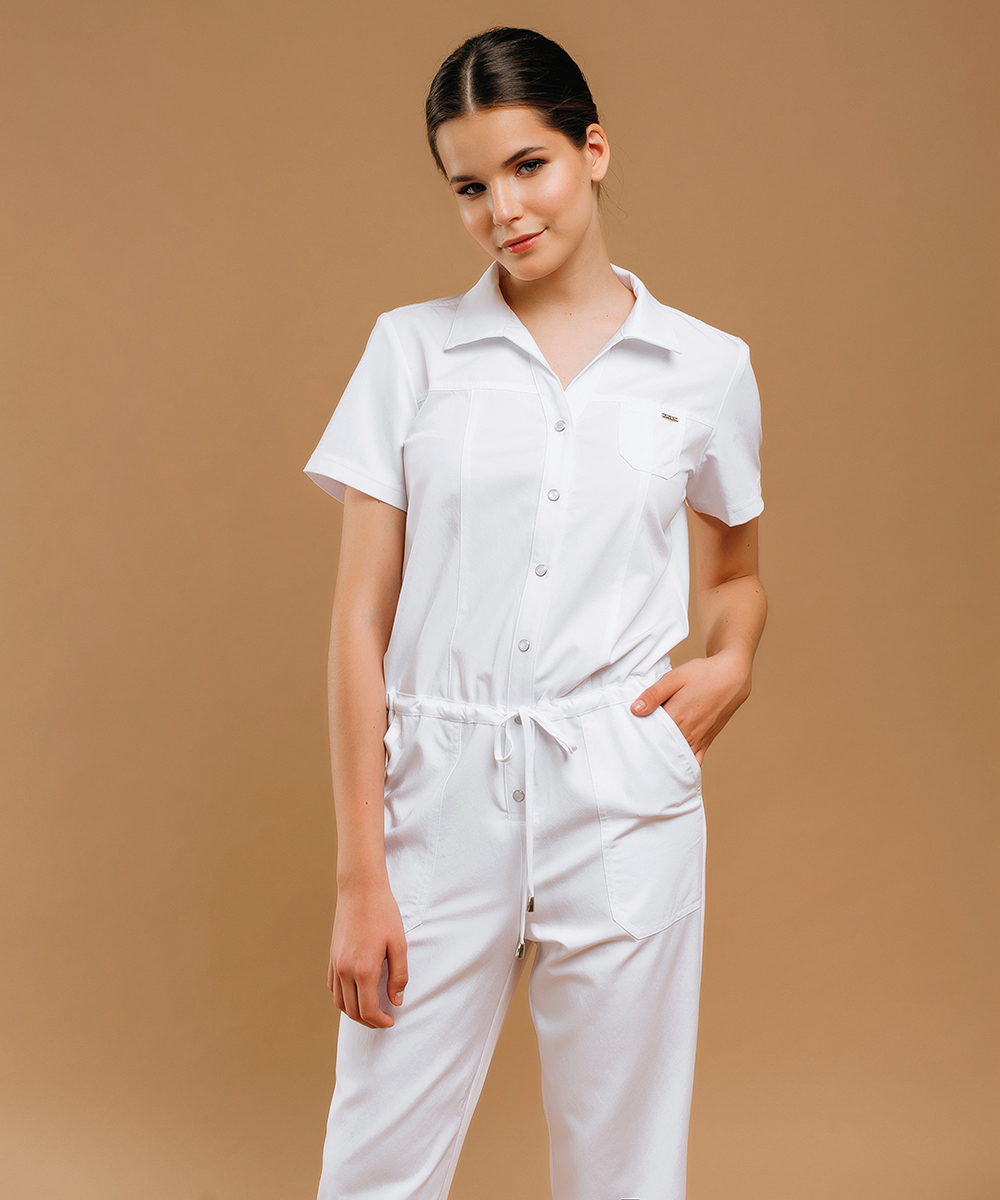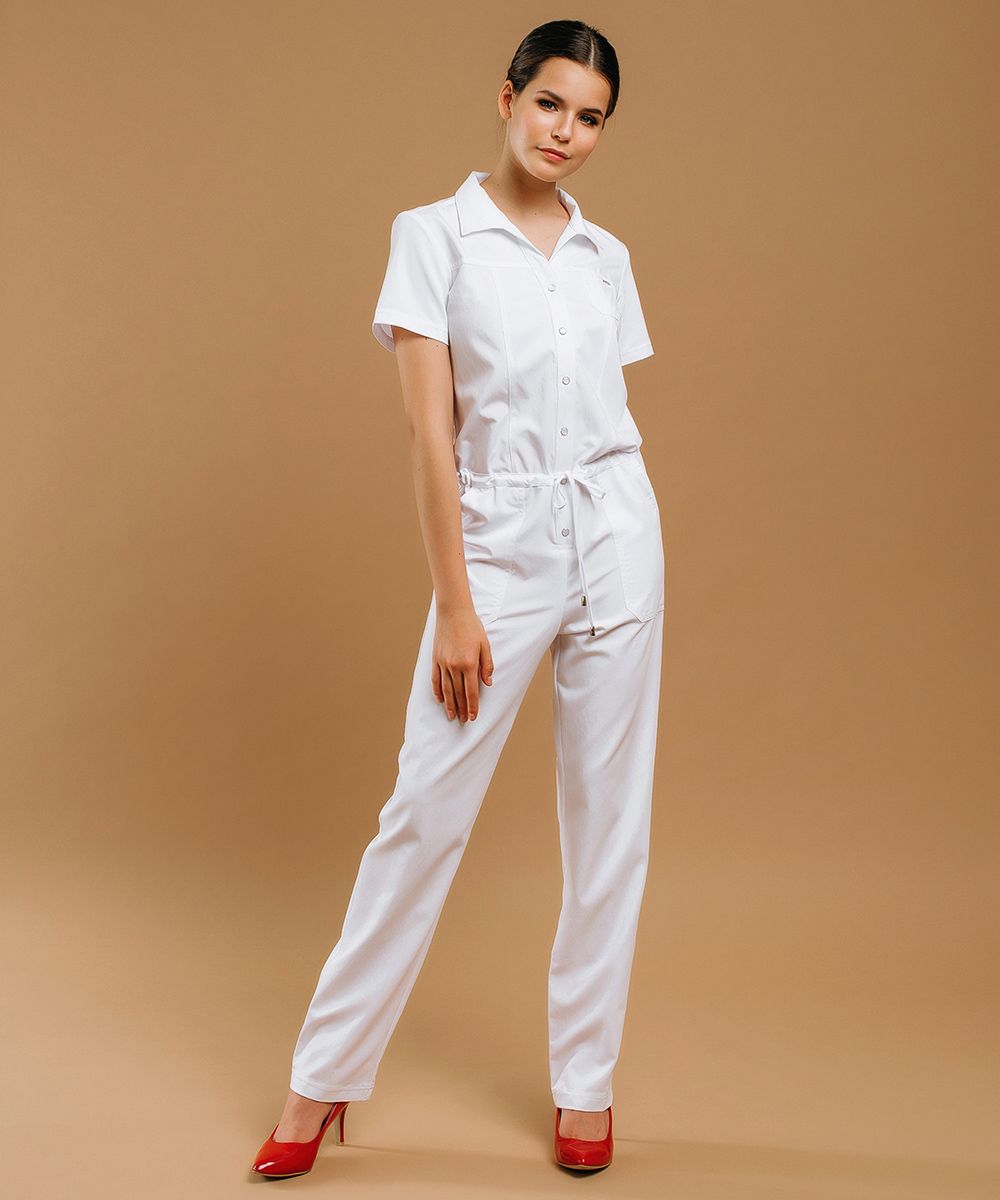 Модель выполнена в базовых белом и черном цветах. Комбинезон можно удачно сочетать как с обувью спортивного типа, так и с классической обувью на каблуке.