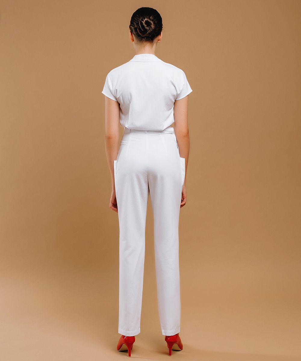 Женственная и изысканная модель комбинезона в классическом стиле привлекает внимание своим необычным кроем. Приталенный силуэт создается за счет красивого длинного пояса на шлевках и складок, расположенных на полочках и спинке по талии.