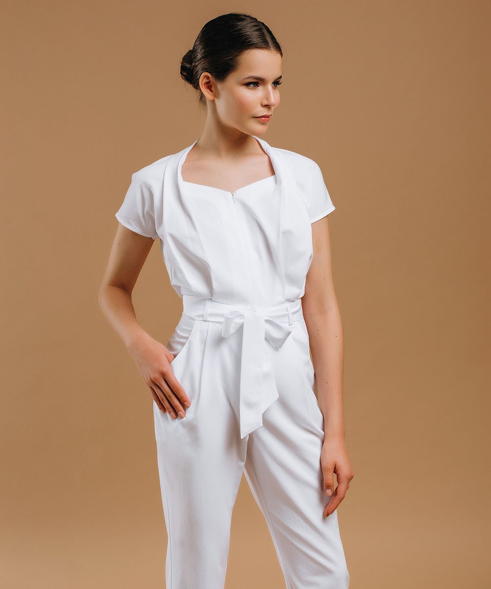 Искусно задрапированный воротник-стойка, переходящий в глубокие боковые складки, образует изящный и сдержанный V-образный вырез на груди. Его продолжает лаконичная металлическая застежка-молния с мелким звеном. Цельнокроеный, короткий и немного приспущенный рукав делает силуэт мягким и гибким. Глубокие и объемные боковые карманы, расположенные на брючинах комбинезона, подчеркивают красоту женских форм и при этом добавляют модели практичности и функциональности.