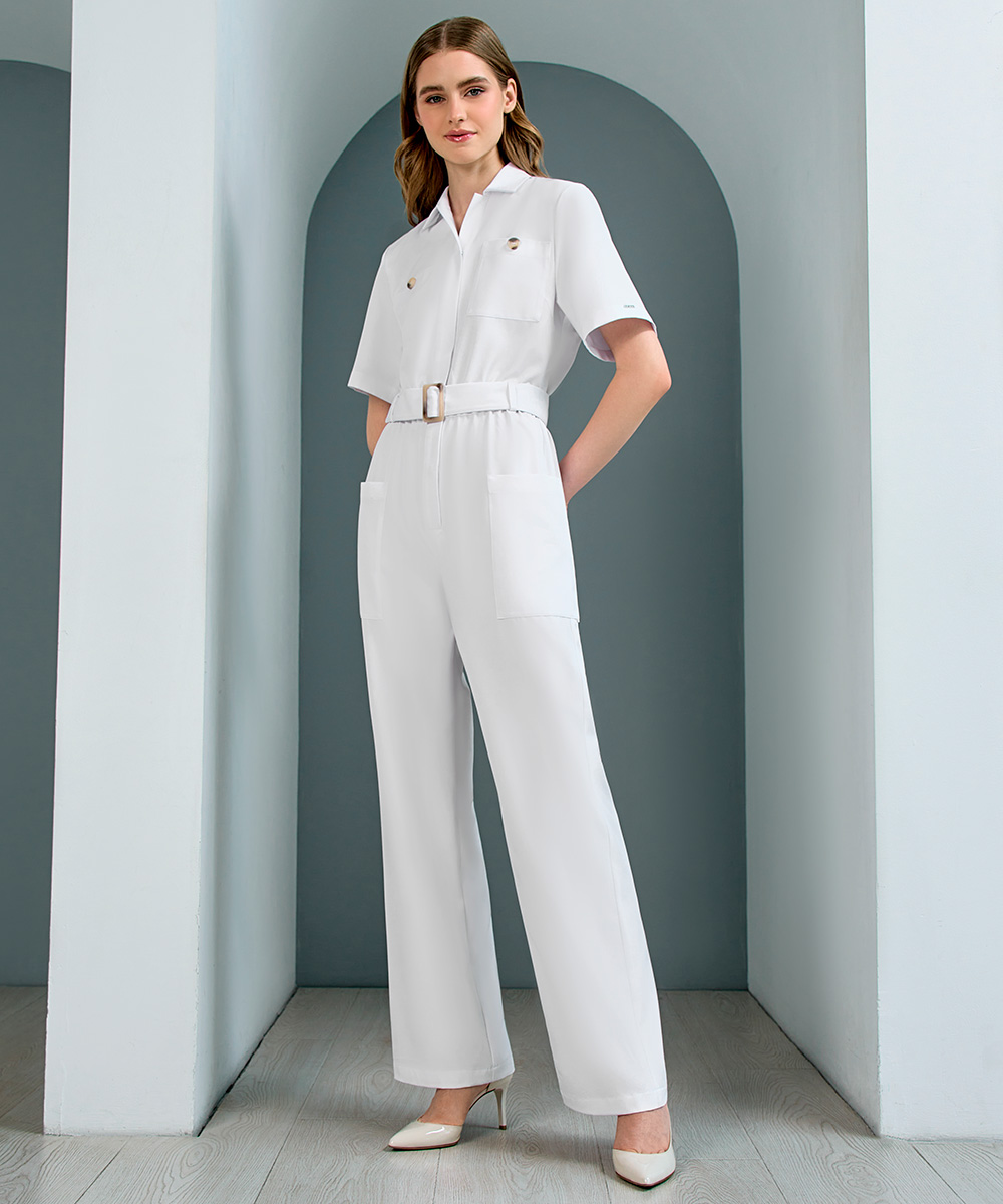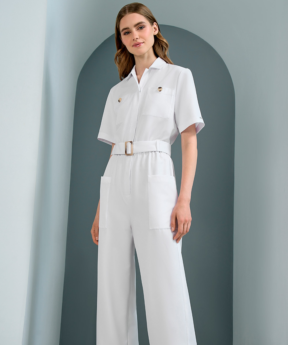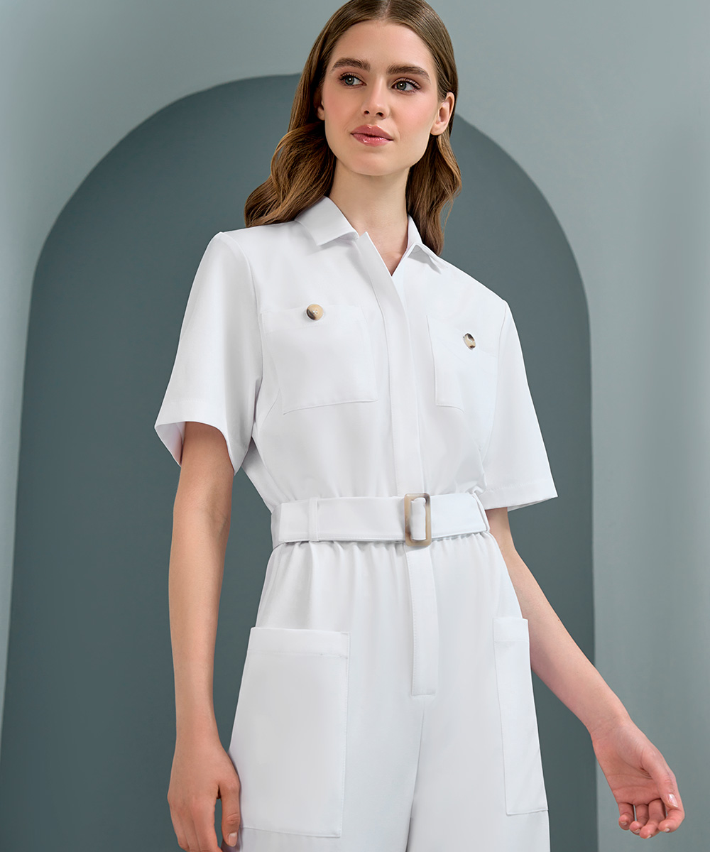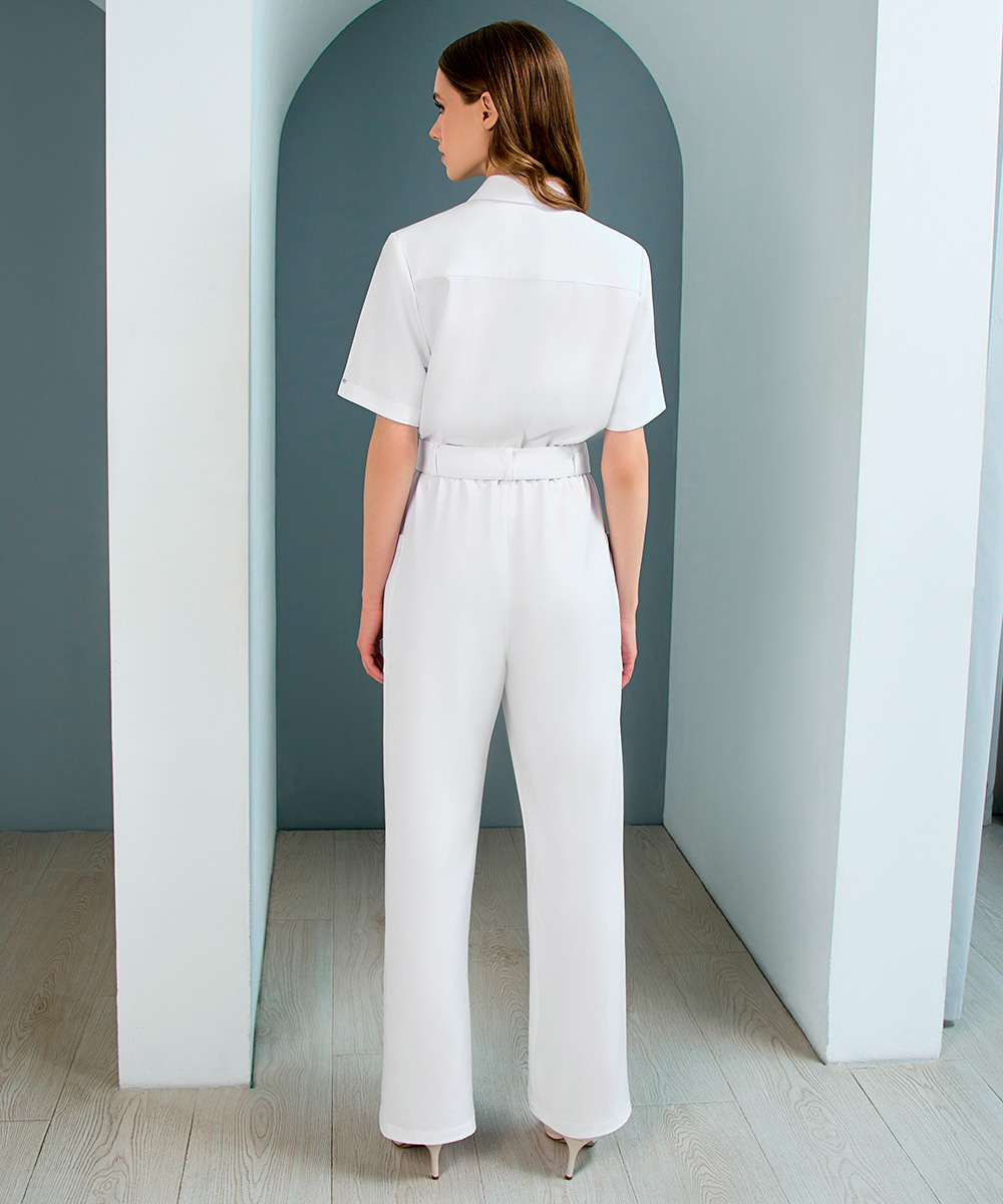 Классический воротник с лацканами, короткий рукав и широкие штанины дополняются объемными накладными карманами, акцентными пуговицами и пряжкой.