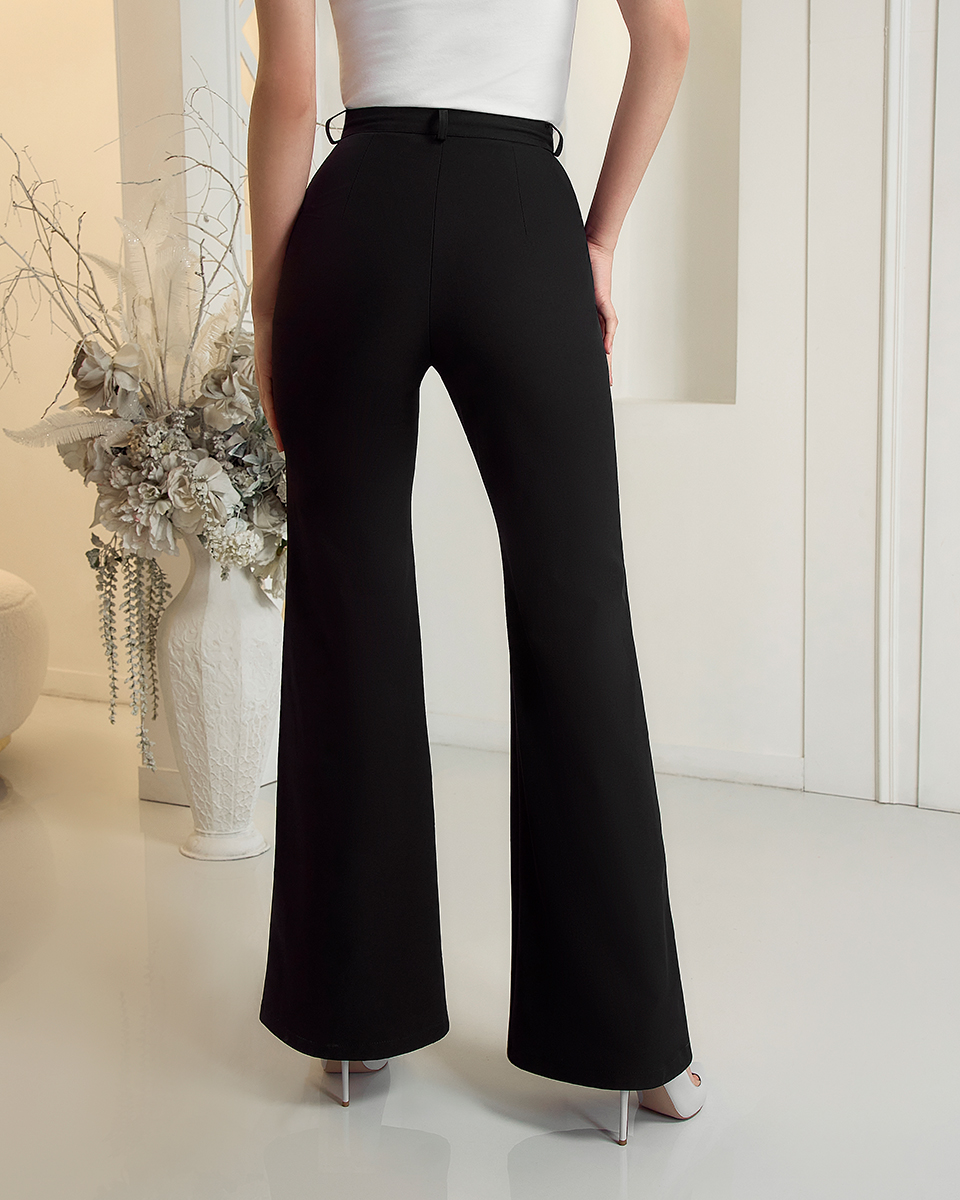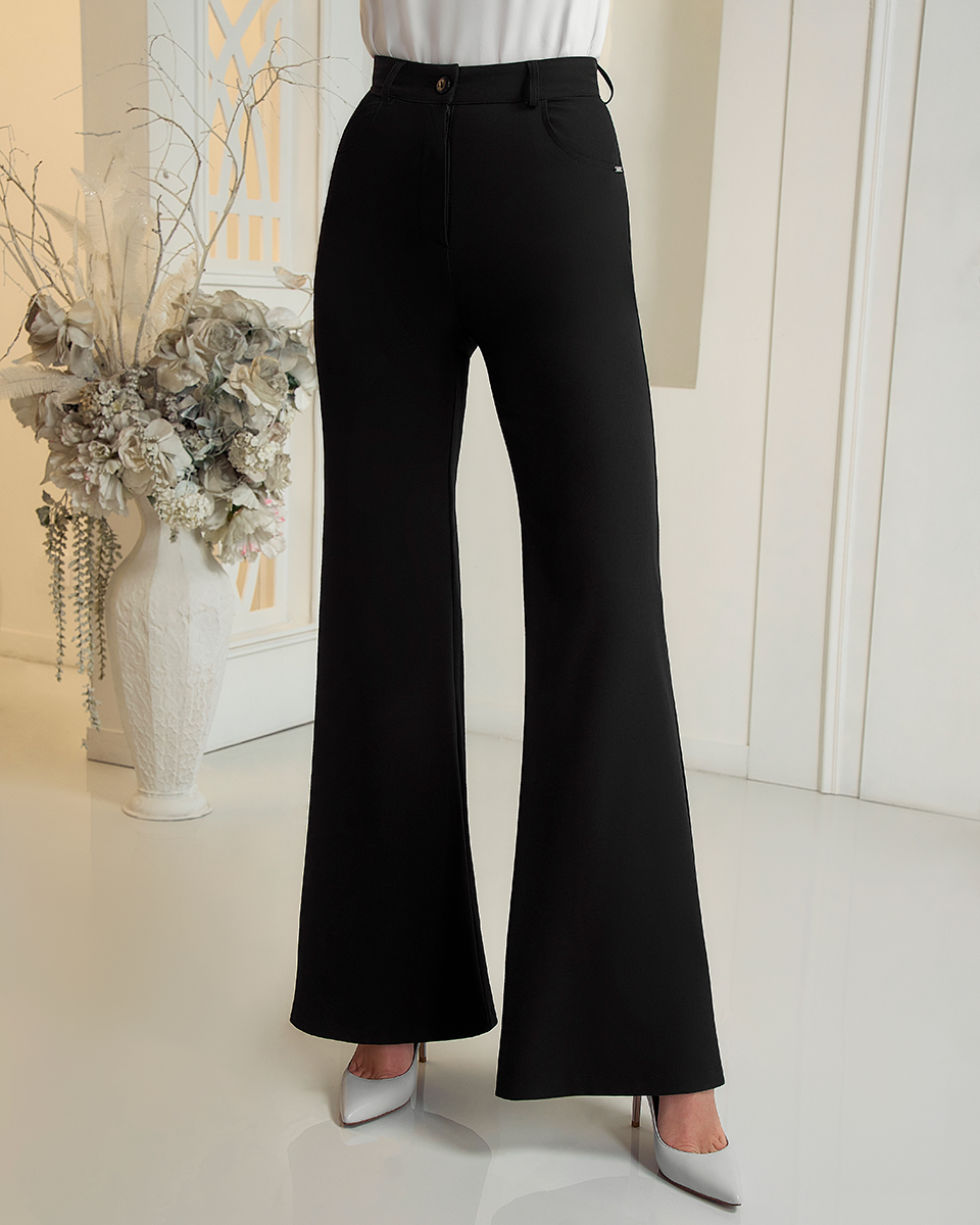 Брюки-клеш из легкой, струящейся ткани с высокой посадкой и широким поясом прекрасно моделируют фигуру.