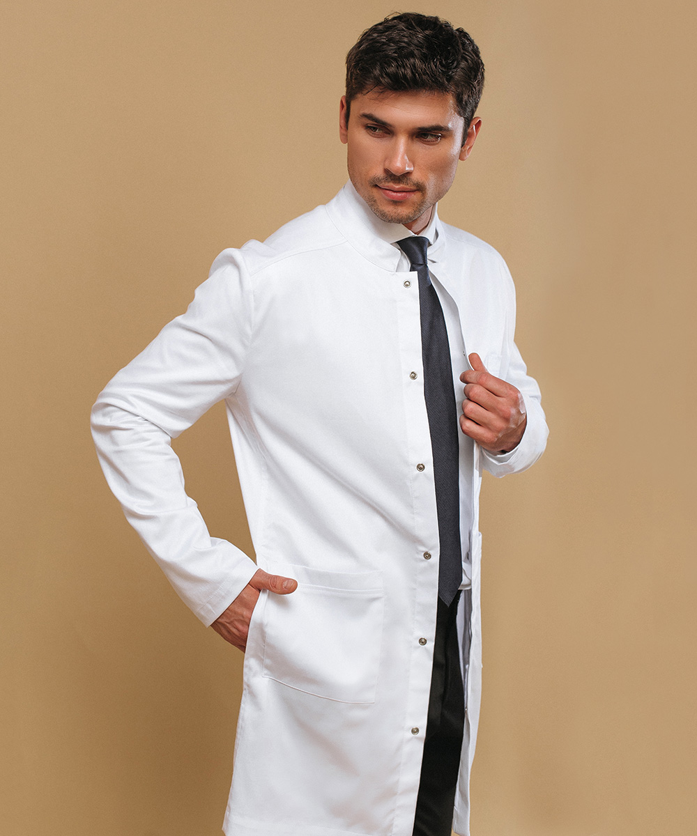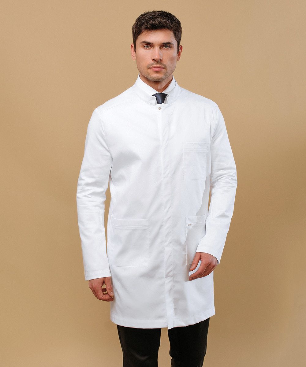 Средний шов в нижней части халата заканчивается шлицей, в боковых швах предусмотрены прорези.