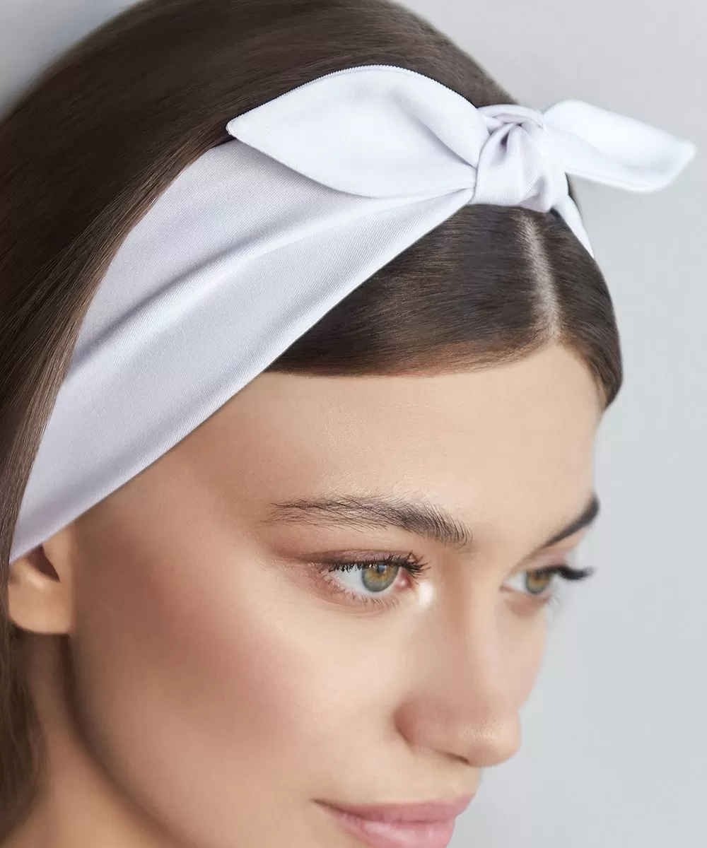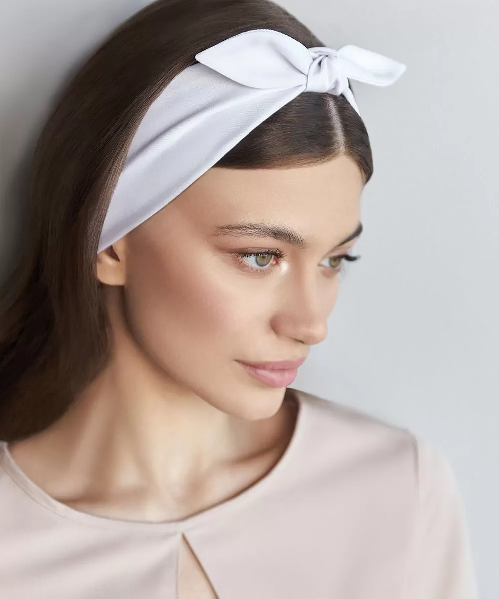 Повязка, собранная наверху аккуратным узлом, имитирующим бант со свободными концами, – изящный и практичный аксессуар.