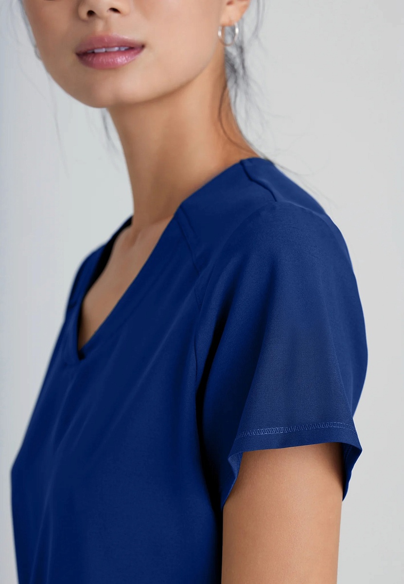 Динамичная блуза Rhythm из новой коллекции Greys Anatomy Evolve Stretch - это ваш классический топ с треугольным вырезом, приталенным силуэтом и ультрасовременным элегантным дизайном. Спереди расположены глубокие и вместительные карманы. С левой стороны есть отделение для авторучки. Рубашечный подол чуть длиннее сзади и особенно хорошо смотрится навыпуск. Края подола и рукавчиков обработаны декоративным швом.