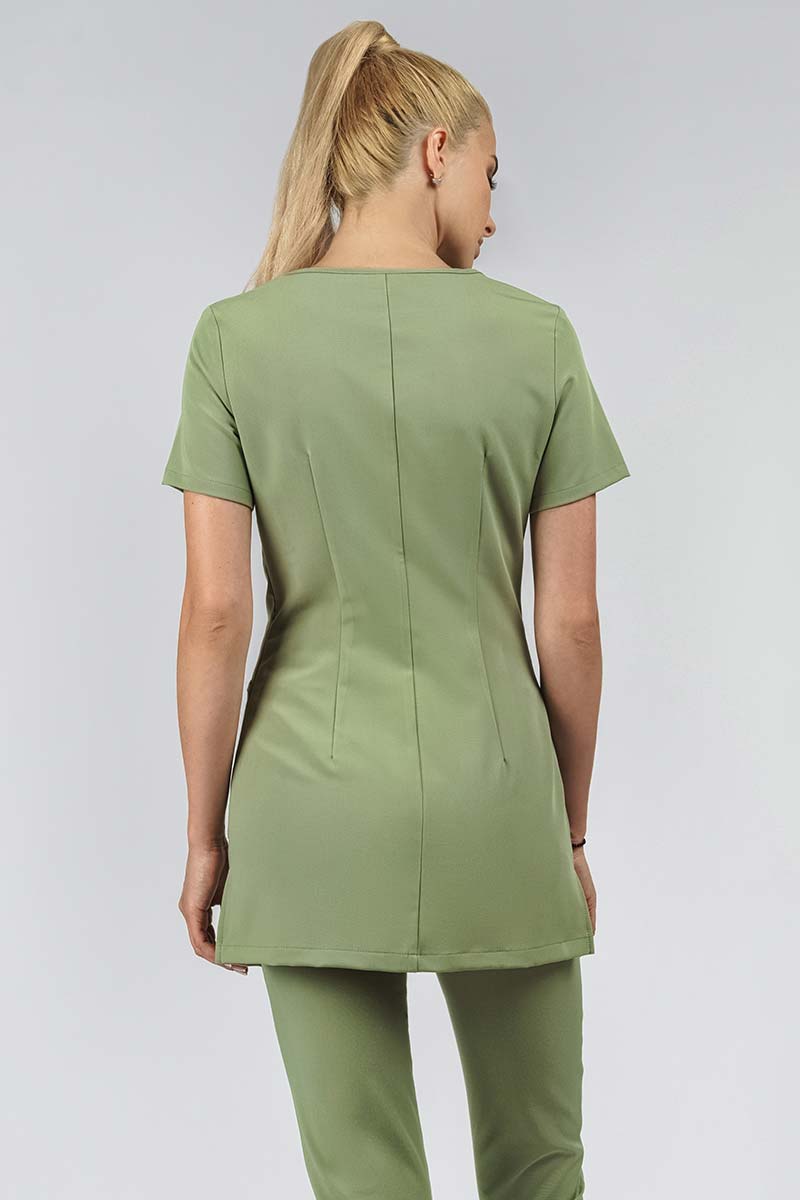 Туника приталенного силуэта с округлыми линиями плеча и горловины с небольшим каплевидным вырезом.