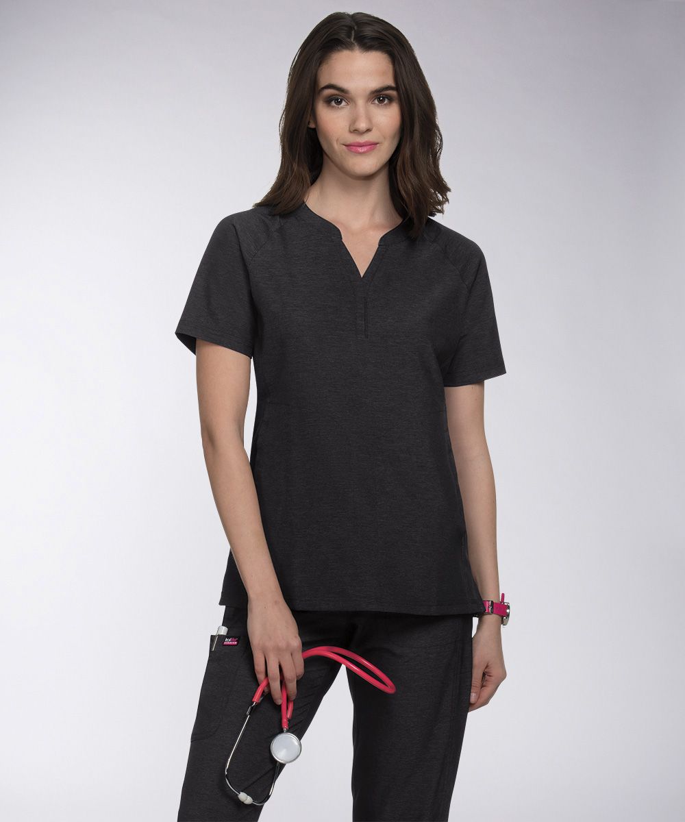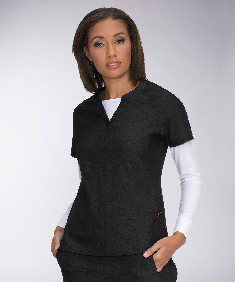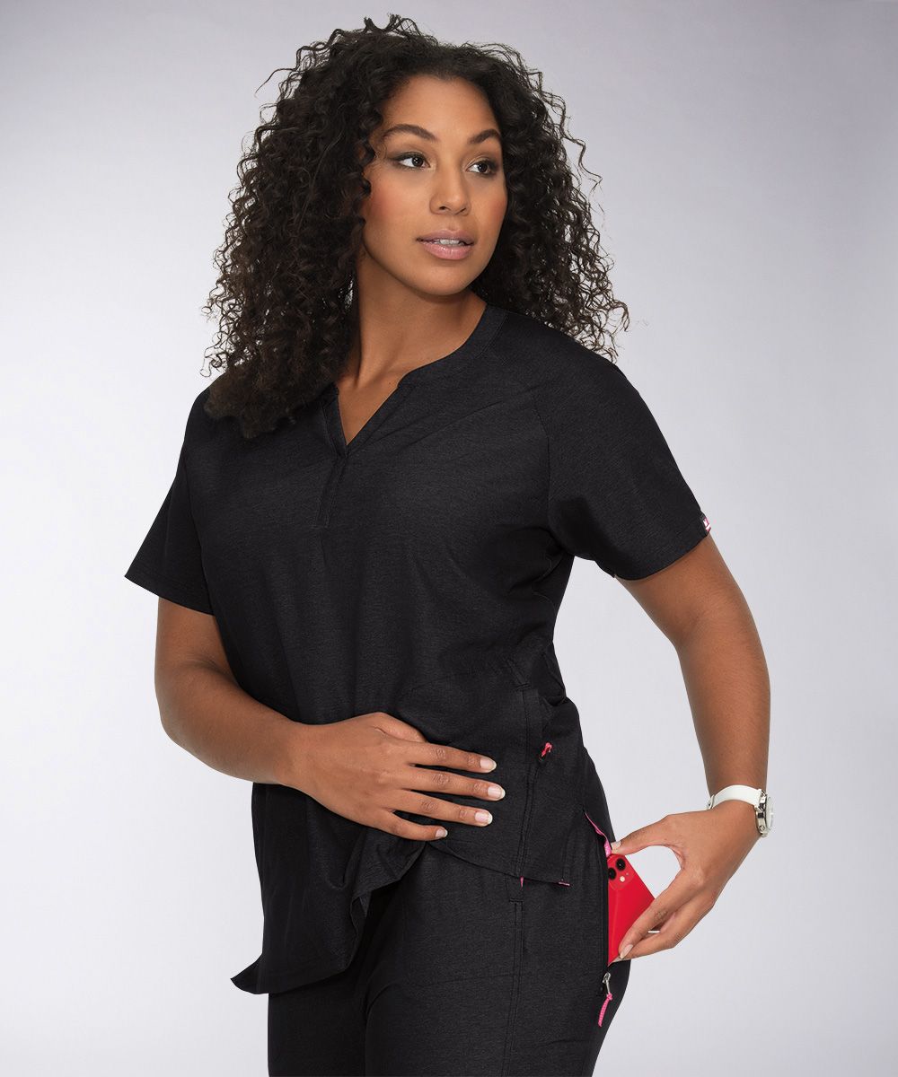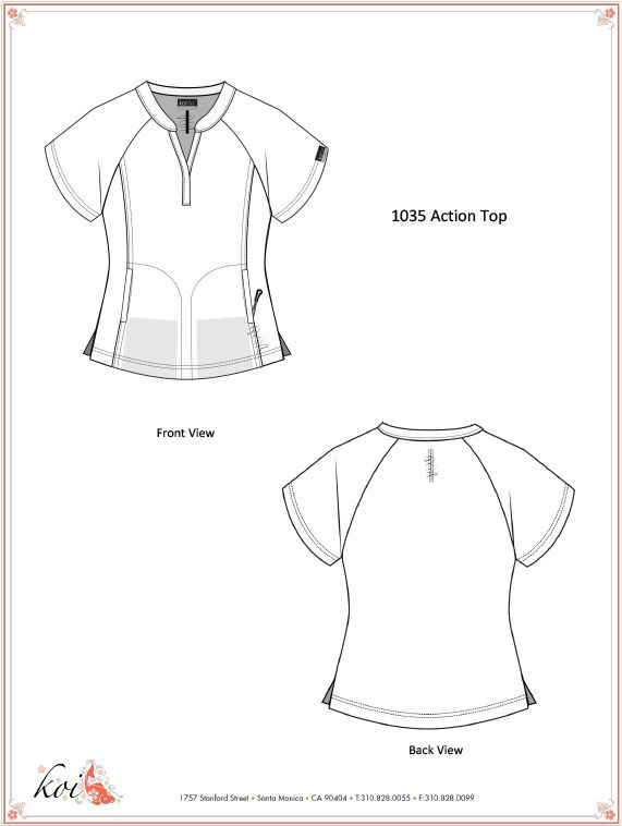 Представляем вашему вниманию модную медицинскую блузу Action из каталога Koi Lite Stretch. Эта модель с короткими рукавами и закруглённым подолом тяготеет к спортивному стилю и может похвастаться множеством декоративных и функциональных элементов. Y-образная горловина изделия сочетается с мягким воротником стойкой, а свободные рукава-реглан отлично смотрятся на любой фигуре. С тыльной стороны ворота пришит контрастный лейбл с логотипом коллекции. На спине имеются вытачки, а ткань в верхней части спинки собрана вертикальным декоративным швом. Спереди изящные швы-«принцесса» выгодно подчёркивают талию. Action обладает парой глубоких втачных карманов, каждый - со скрытыми накладными отделениями. Левый кармашек отличается держателем для ключа, но вы также можете закрепить на нём бейджик или ID-карту. Вентиляционные разрезы по бокам изделия способствуют воздухообмену и поддержанию комфортной температуры. Отдельно отметим, что карманы и боковые разрезы с изнаночной стороны акцентированы контрастным кантом.