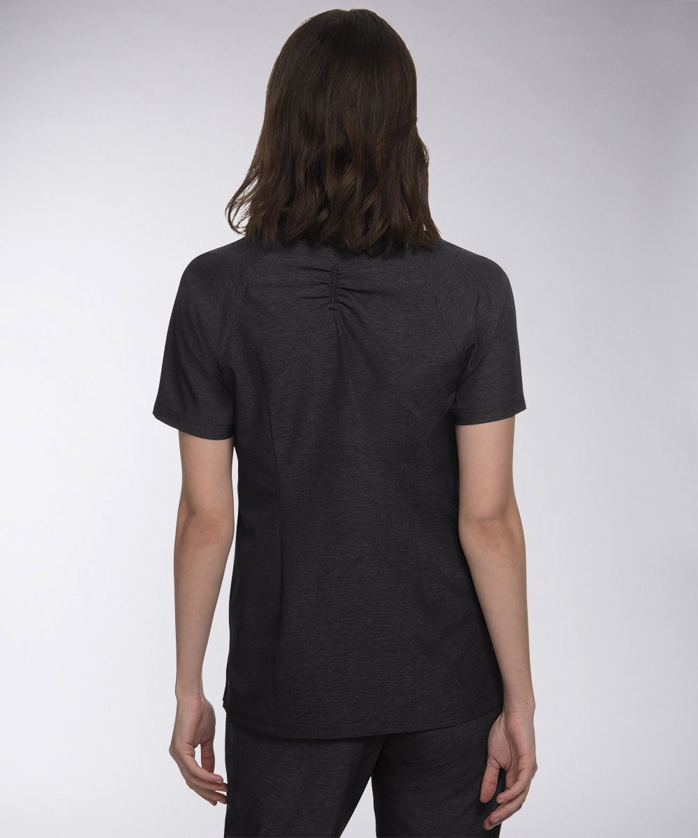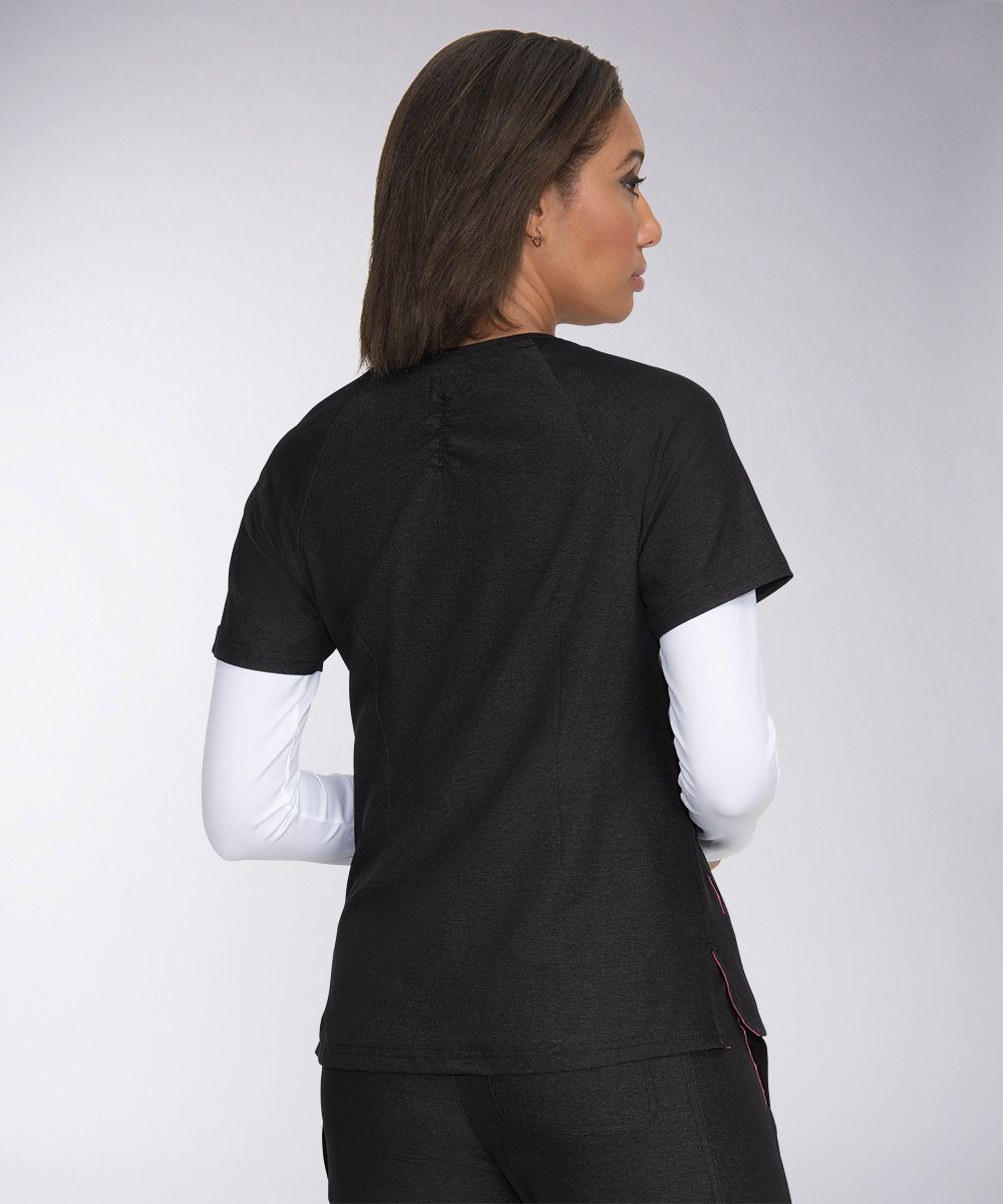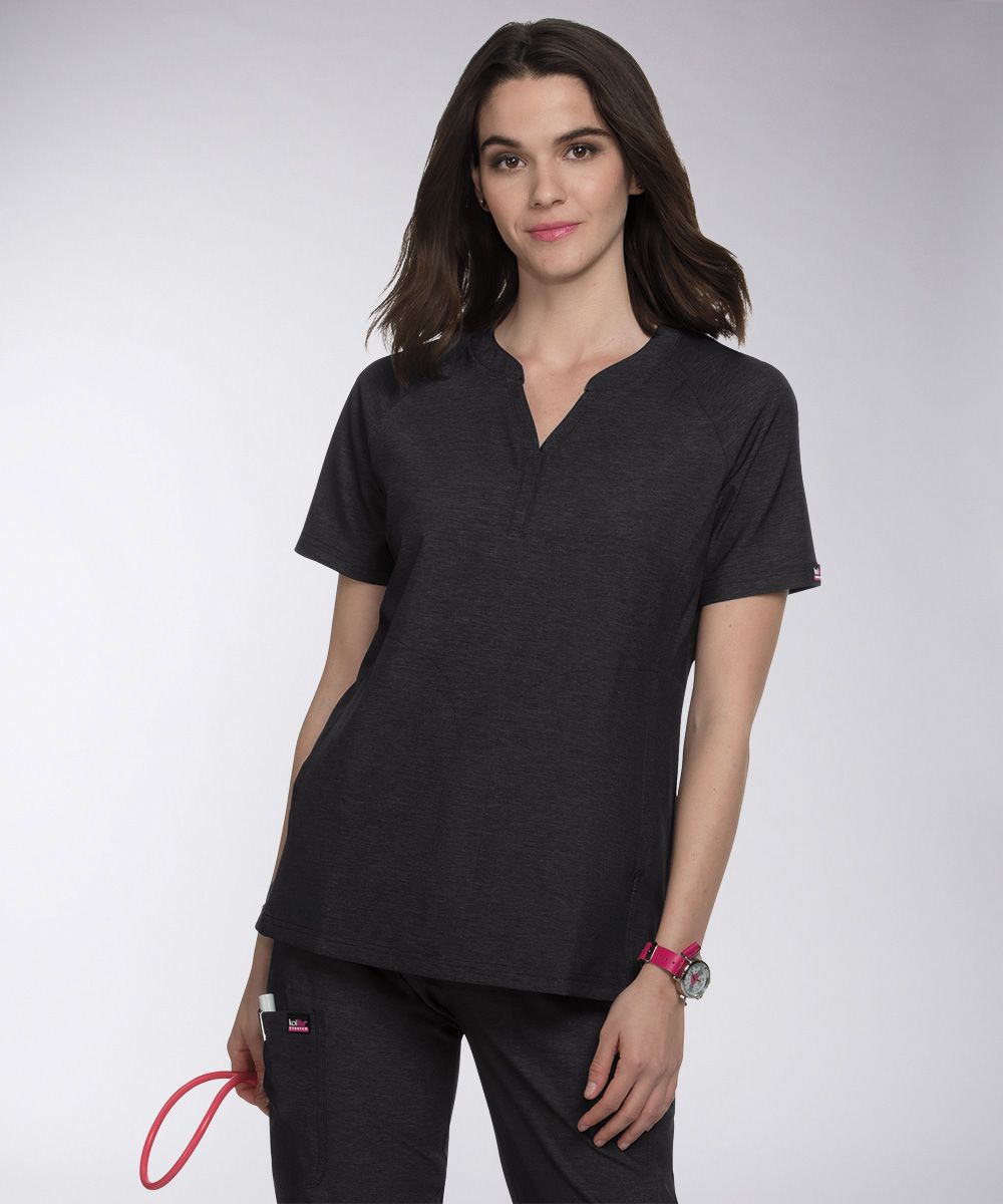 Представляем вашему вниманию модную медицинскую блузу Action из каталога Koi Lite Stretch. Эта модель с короткими рукавами и закруглённым подолом тяготеет к спортивному стилю и может похвастаться множеством декоративных и функциональных элементов. Y-образная горловина изделия сочетается с мягким воротником стойкой, а свободные рукава-реглан отлично смотрятся на любой фигуре. С тыльной стороны ворота пришит контрастный лейбл с логотипом коллекции. На спине имеются вытачки, а ткань в верхней части спинки собрана вертикальным декоративным швом. Спереди изящные швы-«принцесса» выгодно подчёркивают талию. Action обладает парой глубоких втачных карманов, каждый - со скрытыми накладными отделениями. Левый кармашек отличается держателем для ключа, но вы также можете закрепить на нём бейджик или ID-карту. Вентиляционные разрезы по бокам изделия способствуют воздухообмену и поддержанию комфортной температуры. Отдельно отметим, что карманы и боковые разрезы с изнаночной стороны акцентированы контрастным кантом.