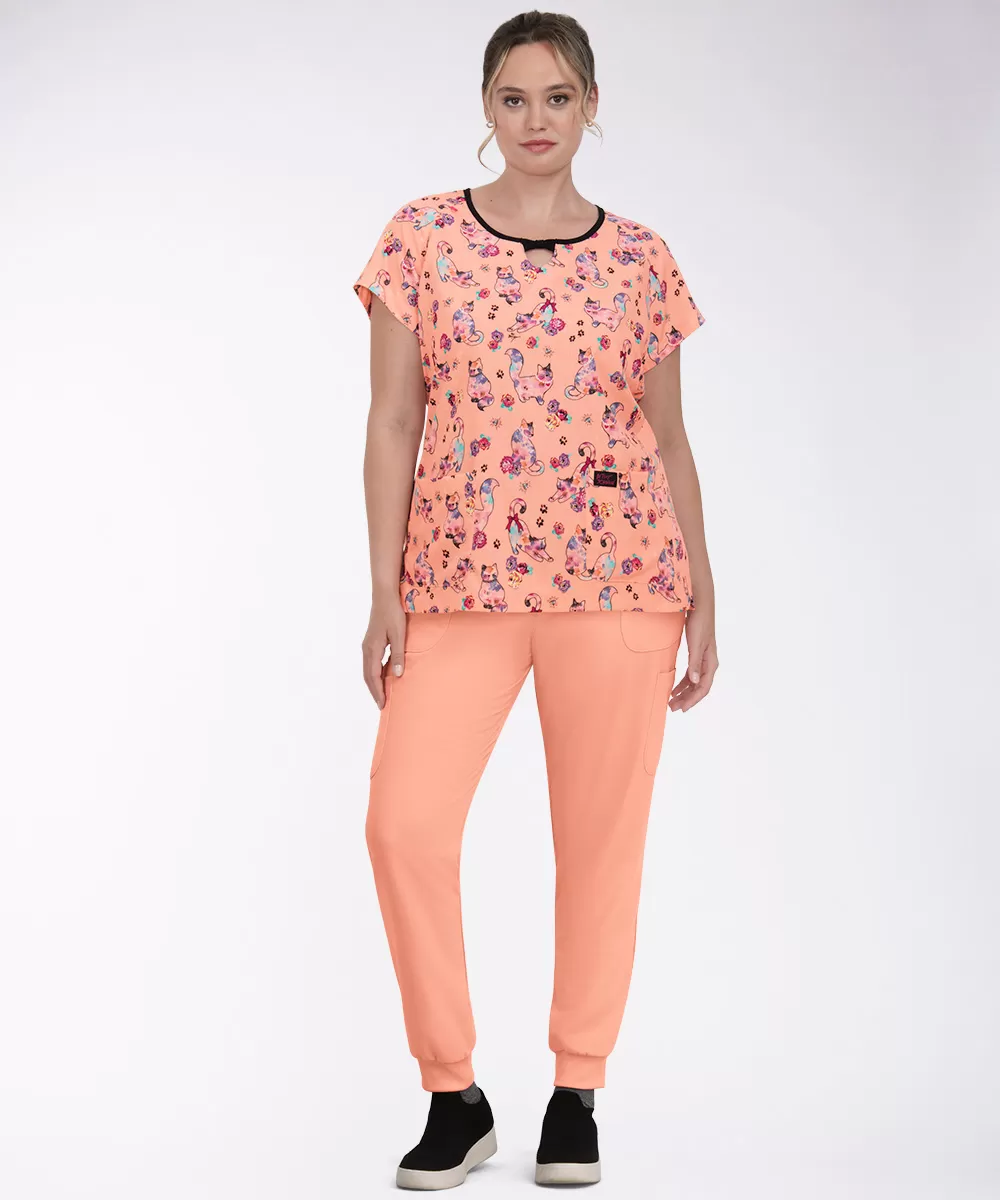 Модель свободного кроя, спинка слегка приталена. Округлый вырез горловины акцентирован тонким чёрным кантом и элегантной стилизованной «бабочкой». Подол прямой спереди и слегка округлый сзади, дополнен накладными карманами и контрастным логотипом коллекции.