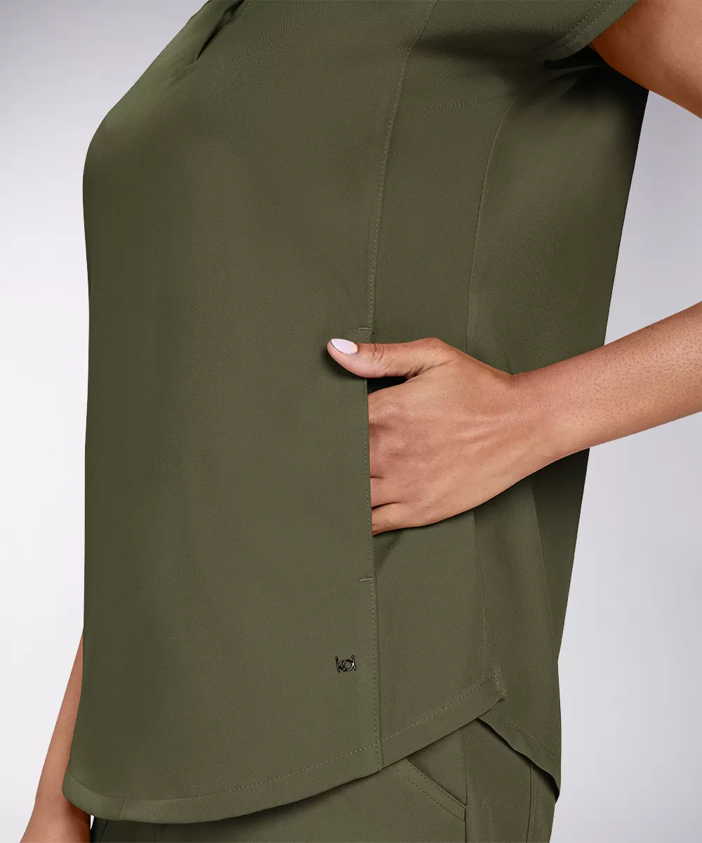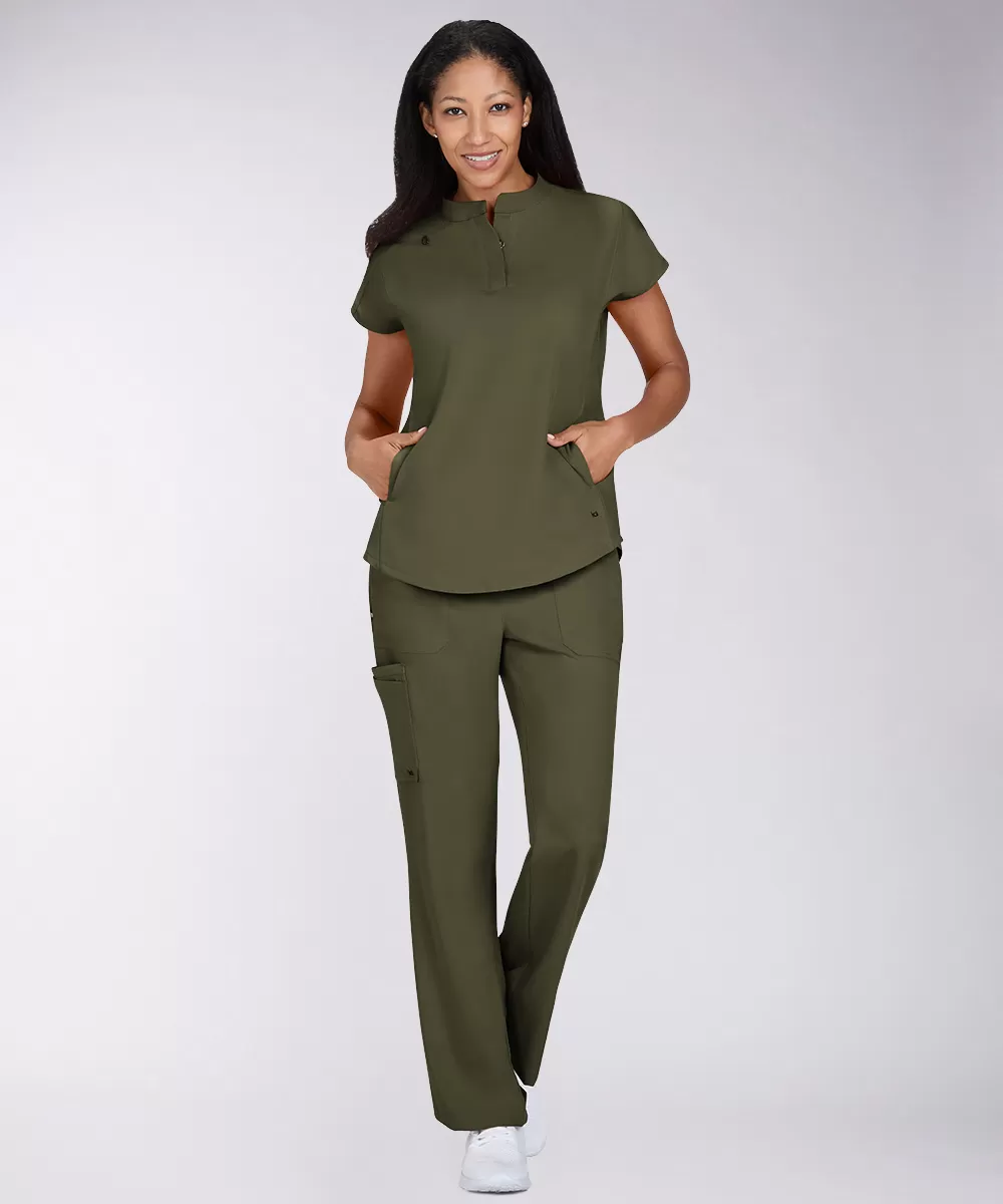 Современный женский топ из коллекции koi Next Gen с высоким воротником с застежкой на пуговицы и спущенным рукавом сочетает элегантность и комфорт. Выполнен из мягкой, эластичной ткани с улучшенным отводом влаги, он обеспечивает прохладу и свободу движений в течение всего рабочего дня. Практичные карманы и петля для удостоверения личности делают топ функциональным и удобным для работы.