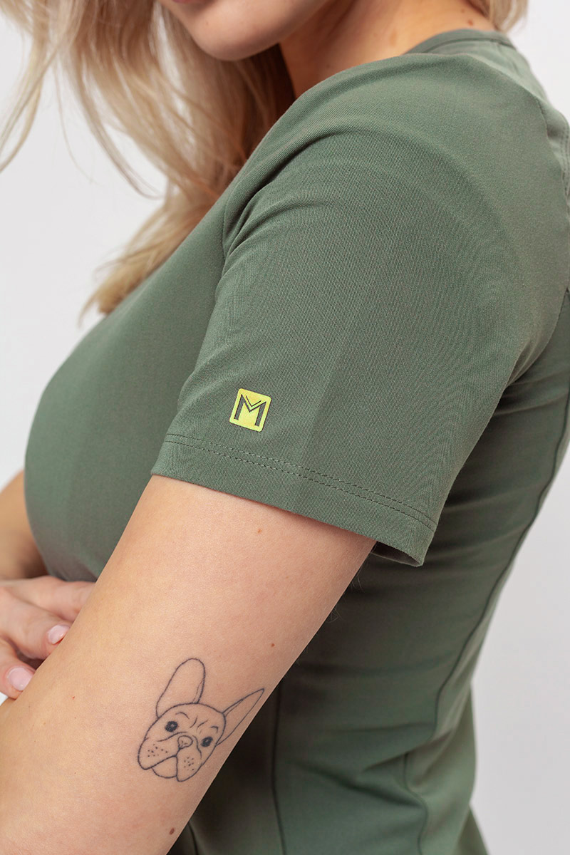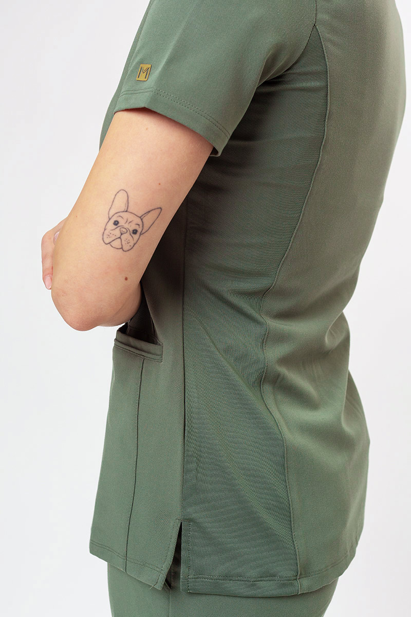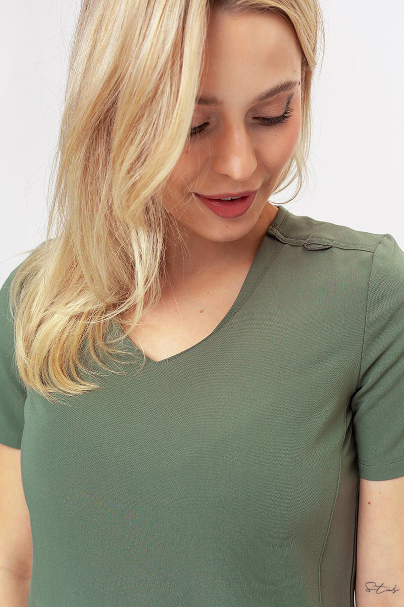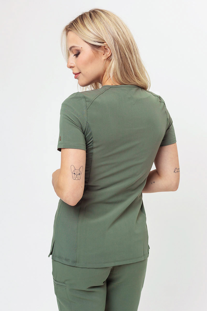 Эта приталенная блуза с элегантно изогнутым V-образным вырезом - ваш безупречный стиль и комфорт в каждом движении. Строгий дизайн подчёркивает аккуратность и высокий профессионализм, а спортивная "нотка" добавляет к вашему образу динамический драйв. И, конечно же, стоит отметить практические детали. Современный эргономичный крой дарит свободу движений без границ. Каждый шов как следует продуман и прострочен. Боковые панели и рукава выполнены из мягкого, плотного и превосходно тянущегося трикотажа. В плечевом шве расположена эластичная петелька для бэйджа, по бокам - два вместительных кармана.