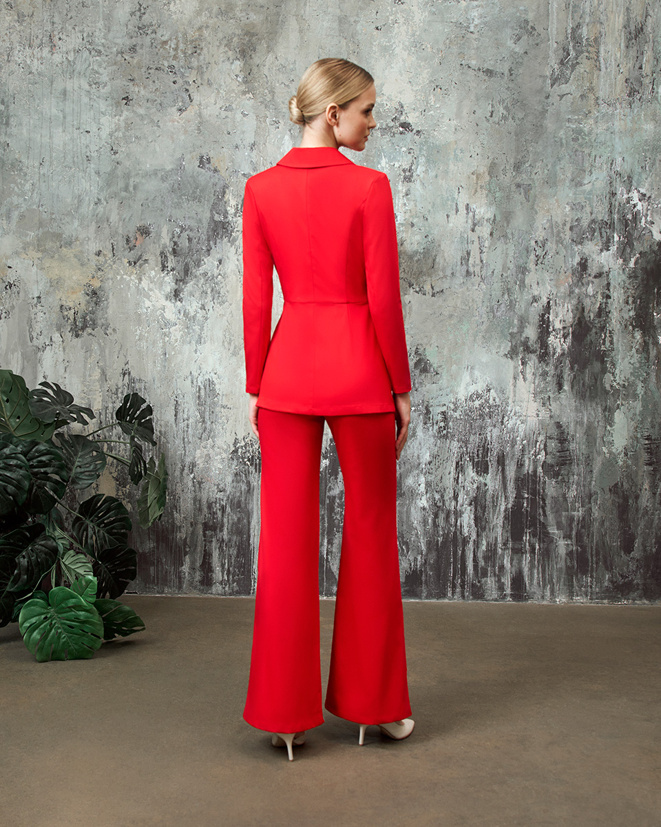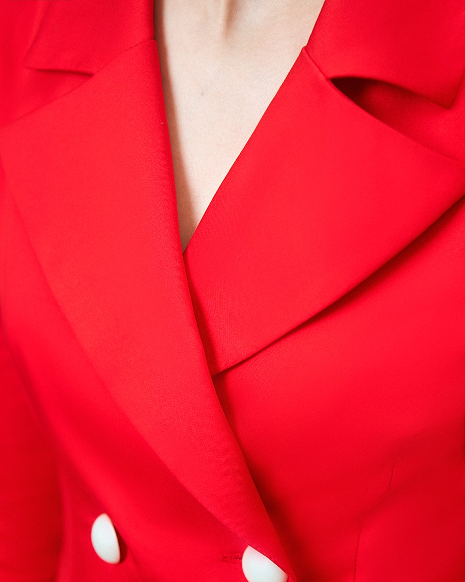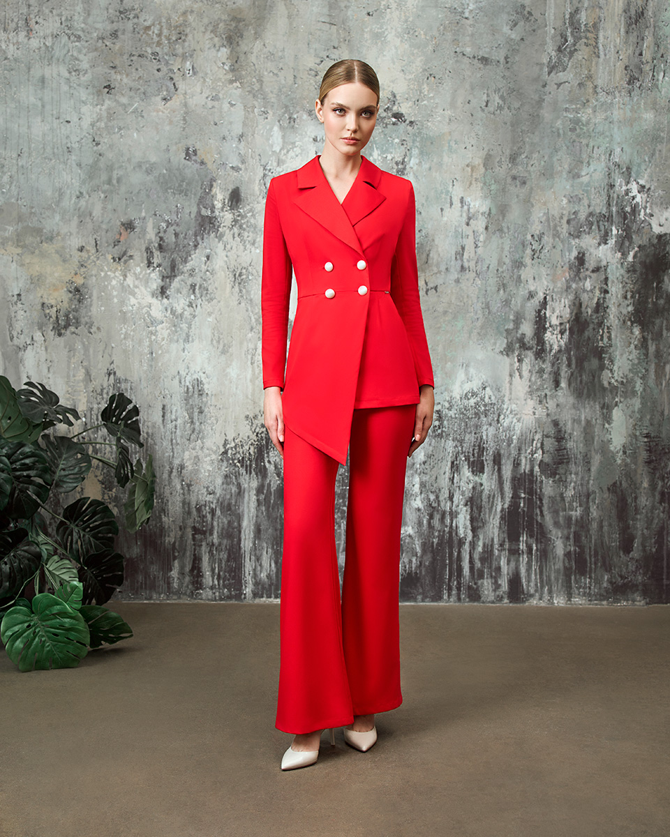 Смелый крой жакета с асимметричной формой, широким воротником с лацканами, отрезной линией пояса и точным расположением пуговиц в виде квадрата задают общий элегантный стиль.
