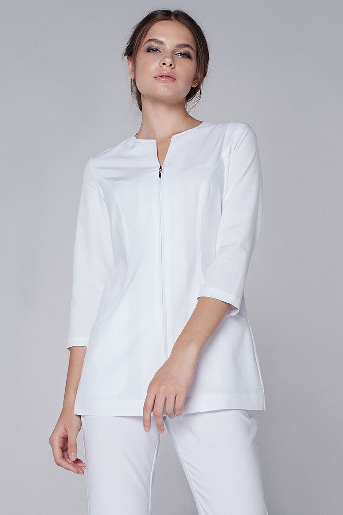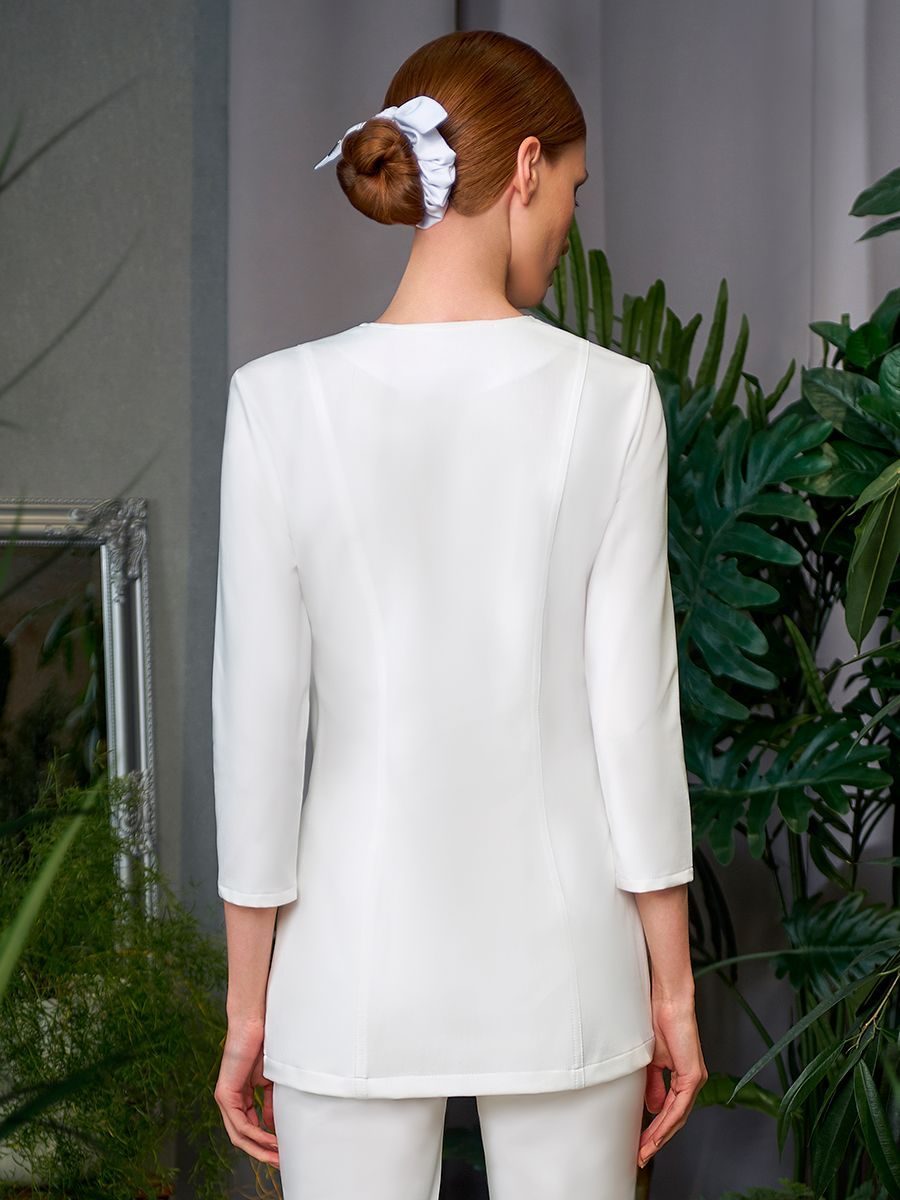 Фигурная горловина, являющаяся необычным изящным акцентом, плавно переходит в неглубокое декольте. Его продолжает застежка-молния с аккуратным металлизированным звеном. С общей геометрией перекликаются боковые рельефы, имеющие свое продолжение в закруглённых линиях кармана, что делает их незаметной частью идеально чистого образа. Втачные рукава ¾ выглядят женственно и служат для создания профессионального комфорта. Боковые рельефы на спинке изделия подчеркивают женственность фигуры и обеспечивают идеальную посадку.