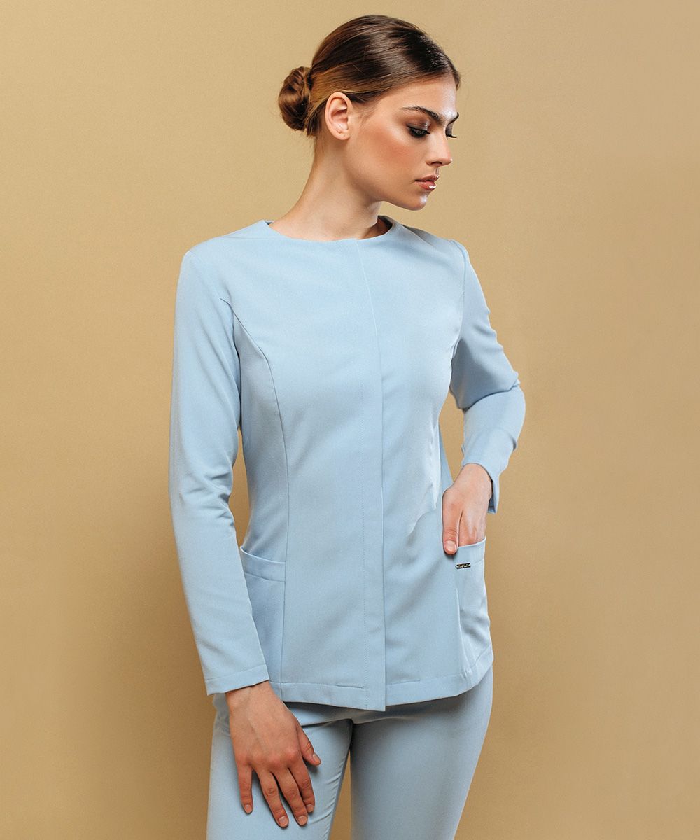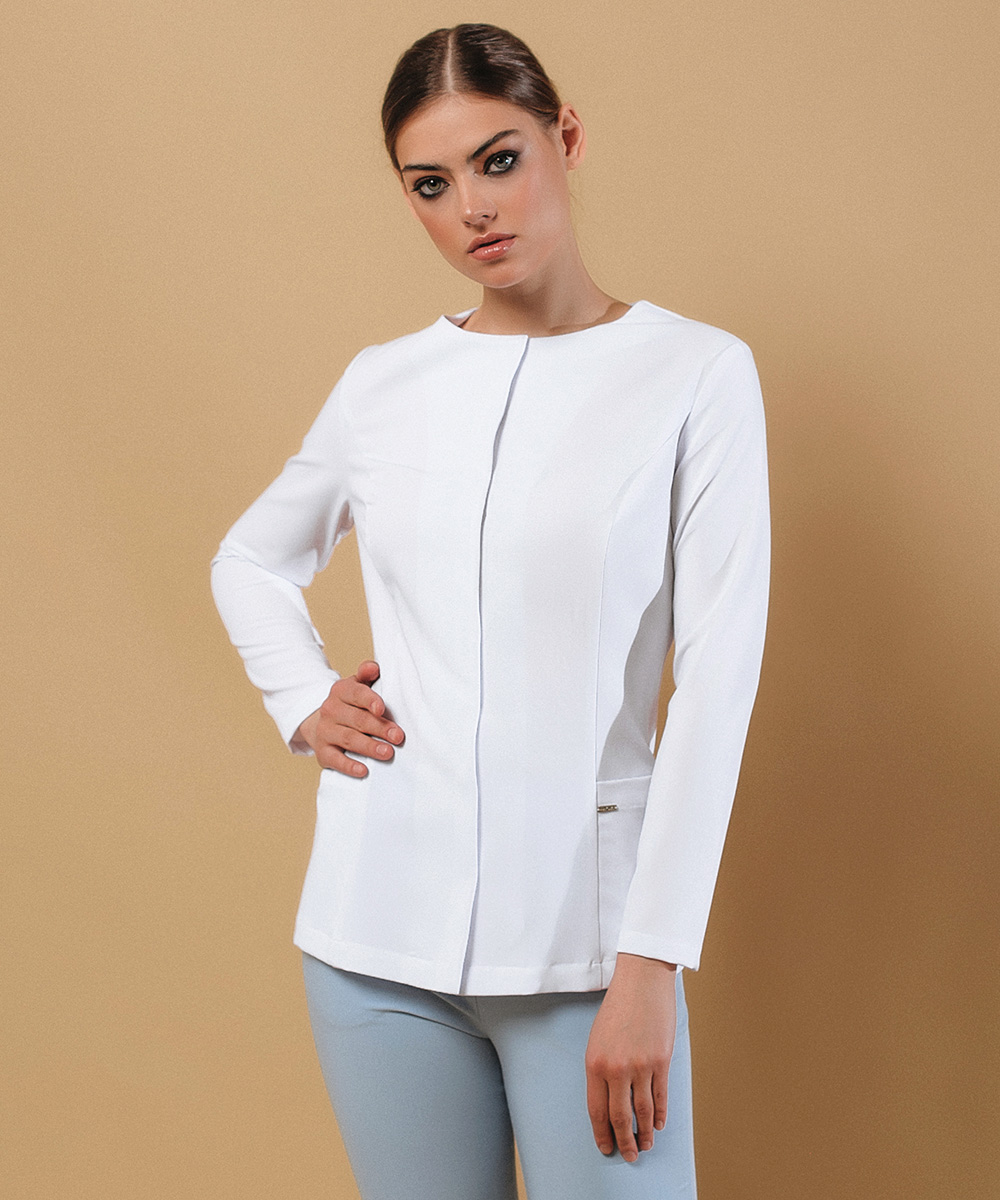 Втачные длинные рукава и округлая горловина соединяются линией плеча.