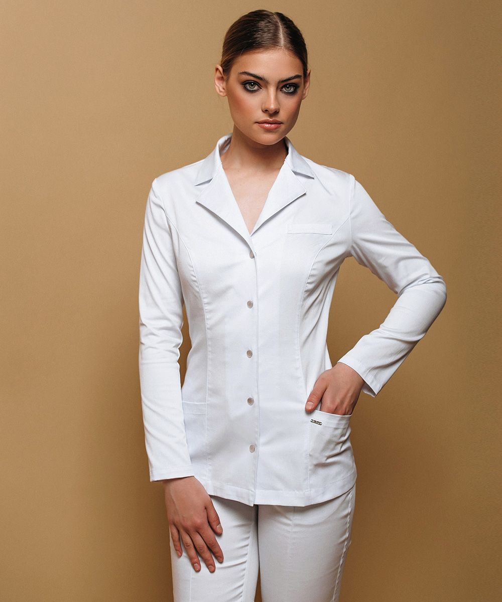 Классический жакет с английским воротником, застежкой на кнопках и прямыми втачными рукавами полной длины.