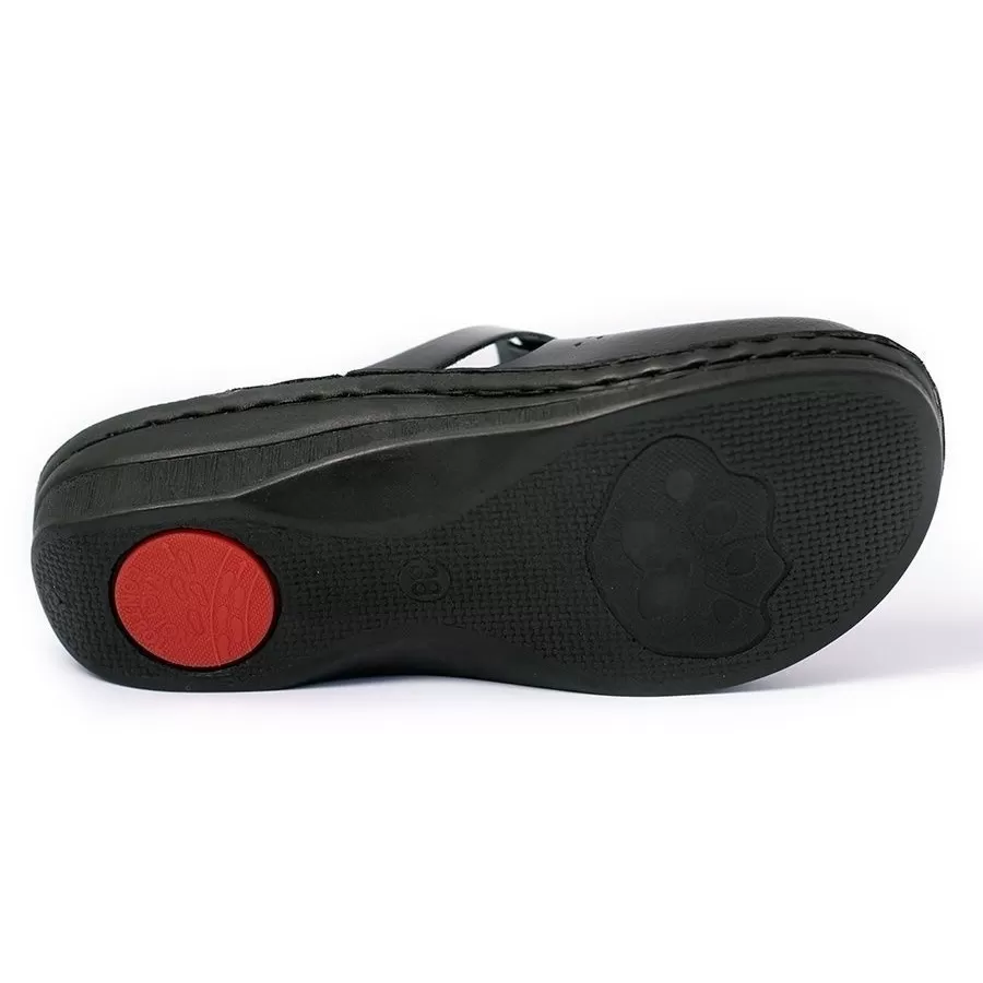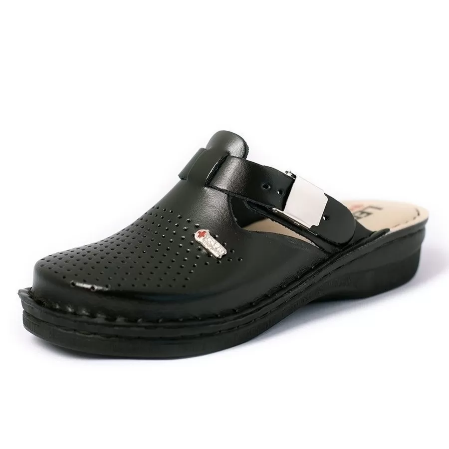 Кожа, из которой выполнена верхняя часть обуви, прошла специальную санитарную обработку, благодаря которой материал легко моется, отталкивает влагу и не впитывает запахи. Перфорация и открытая пятка создают превосходную вентиляцию, так что, ваши ноги остаются сухими даже во время напряжённой работы. Ремешок с удобной застёжкой регулирует плотность обхвата.