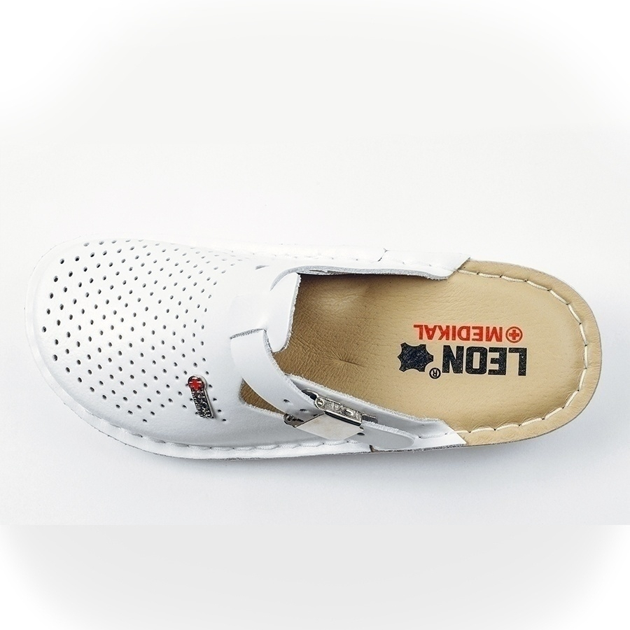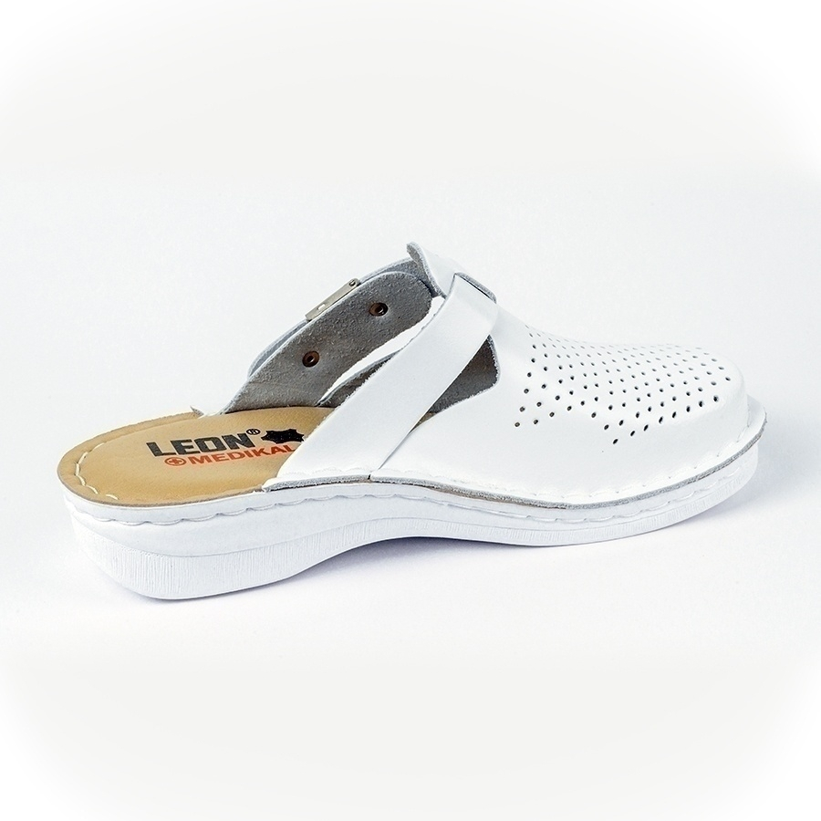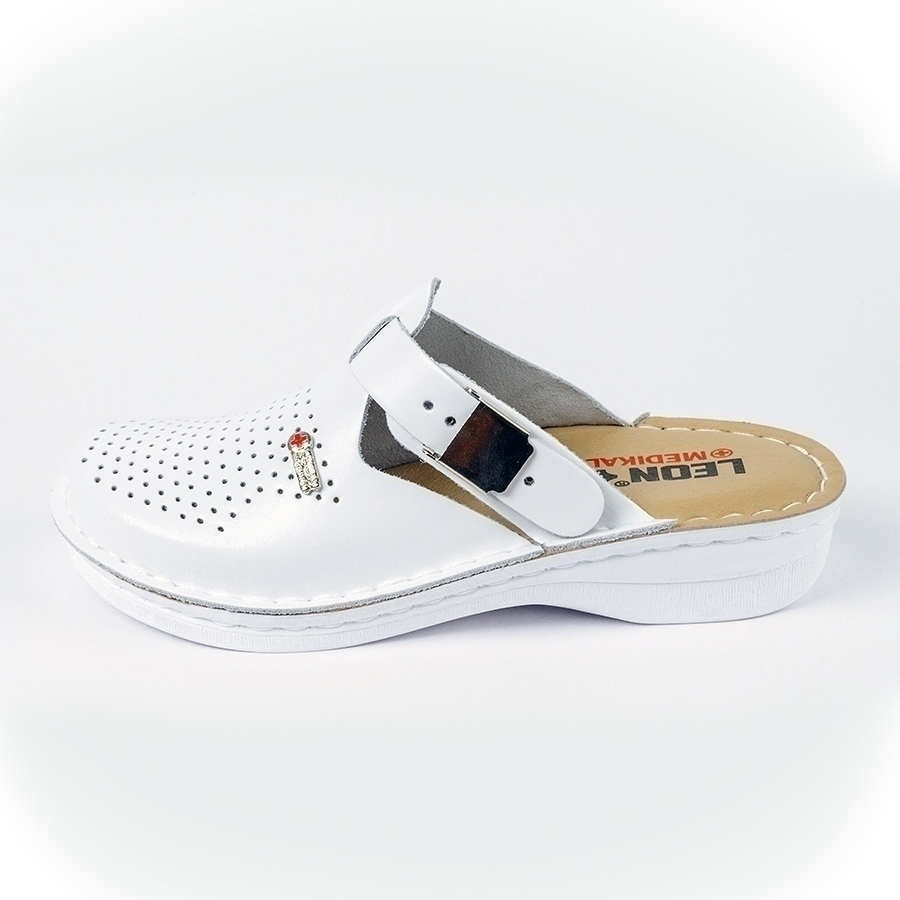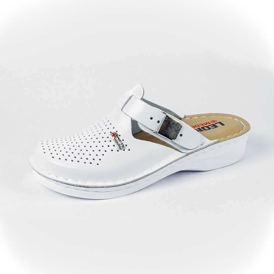 Кожа, из которой выполнена верхняя часть обуви, прошла специальную санитарную обработку, благодаря которой материал легко моется, отталкивает влагу и не впитывает запахи. Перфорация и открытая пятка создают превосходную вентиляцию, так что, ваши ноги остаются сухими даже во время напряжённой работы. Ремешок с удобной застёжкой регулирует плотность обхвата.