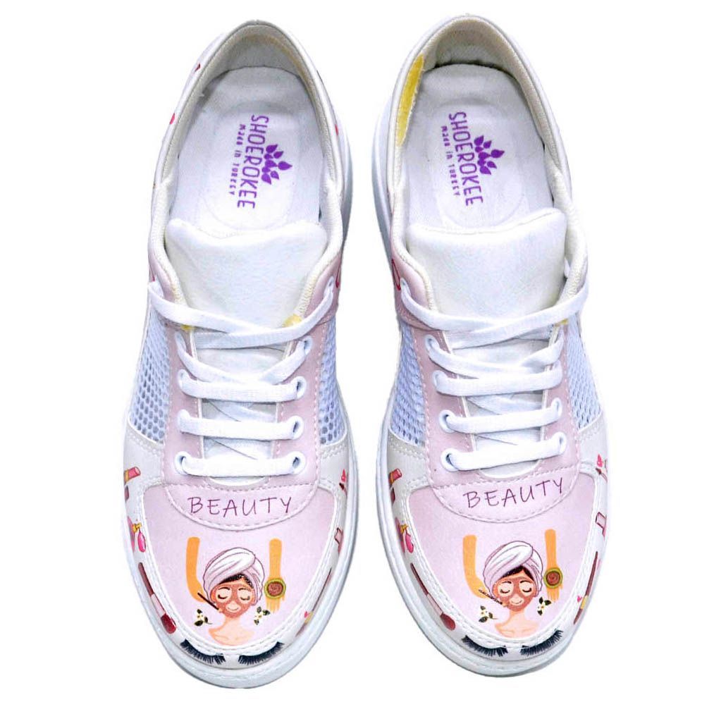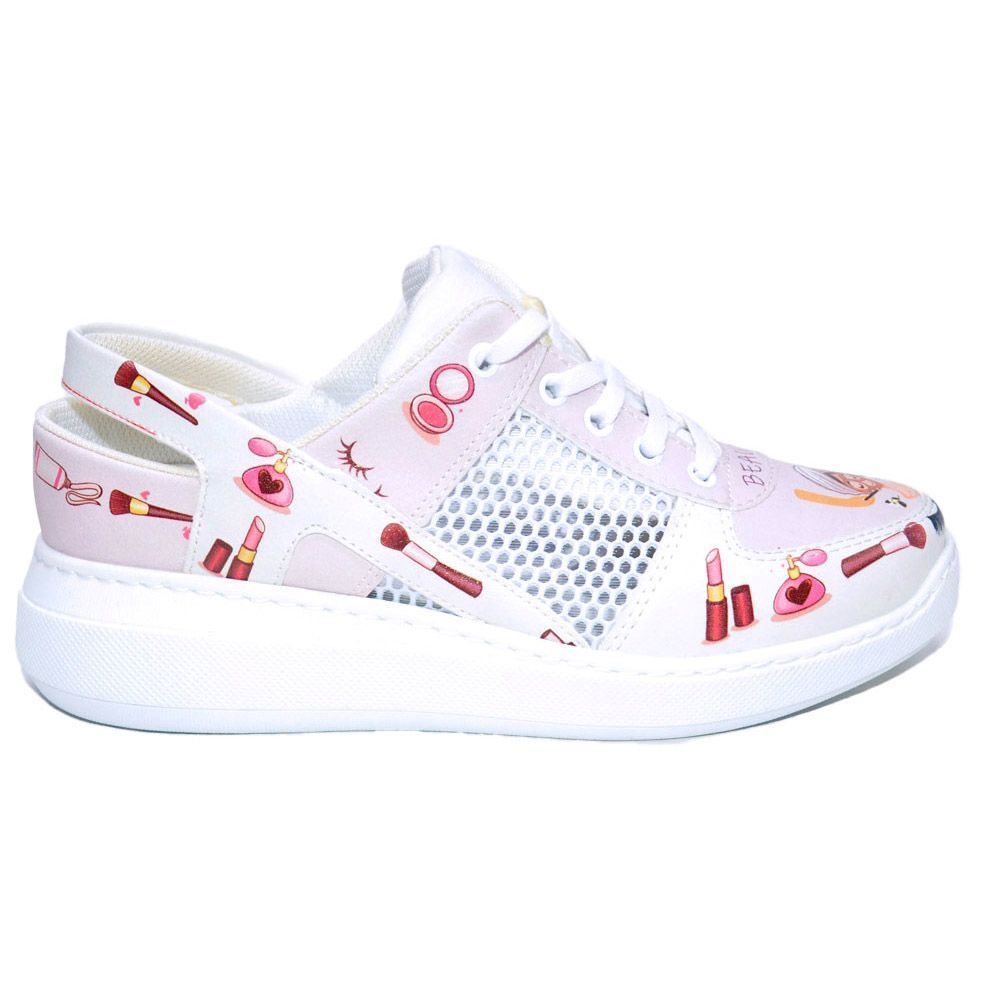 Очаровательная мягкая модель кроссовок, которая максимально открывает ногу. Кожа дышит за счет открытой пятки и сетки с крупными ячейками, вшитой по бокам. Чтобы обувь не слетала с ноги, сзади предусмотрен комфортный ремешок для пятки. Нежный кремовый оттенок, розовая отделка, тематический рисунок – все соответствует профессиям индустрии красоты, например, косметологии.