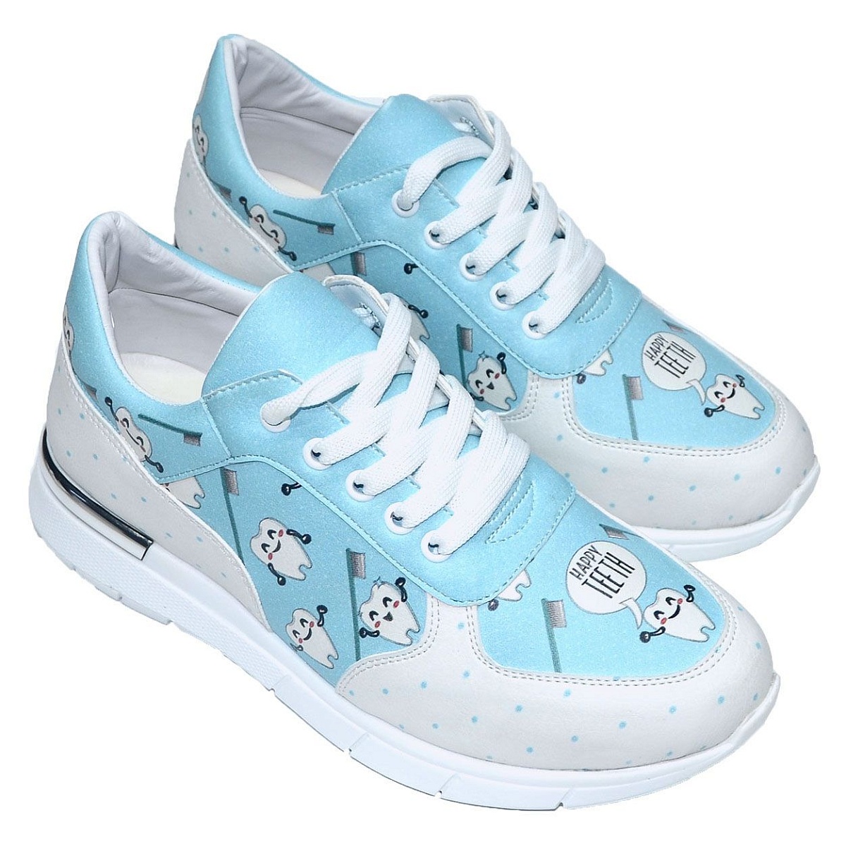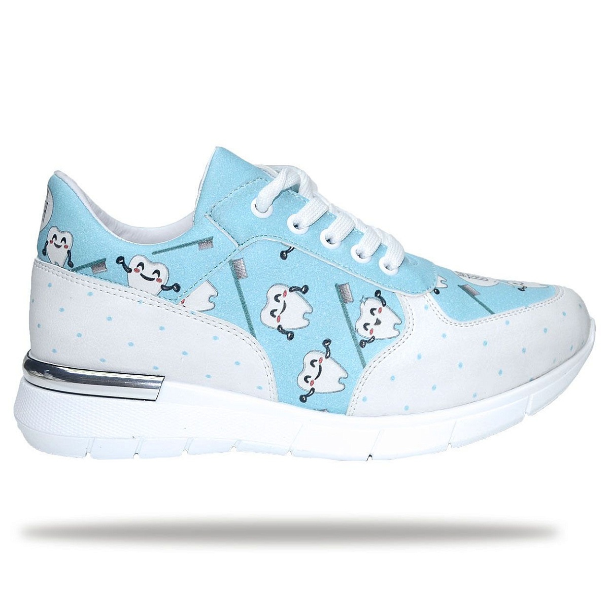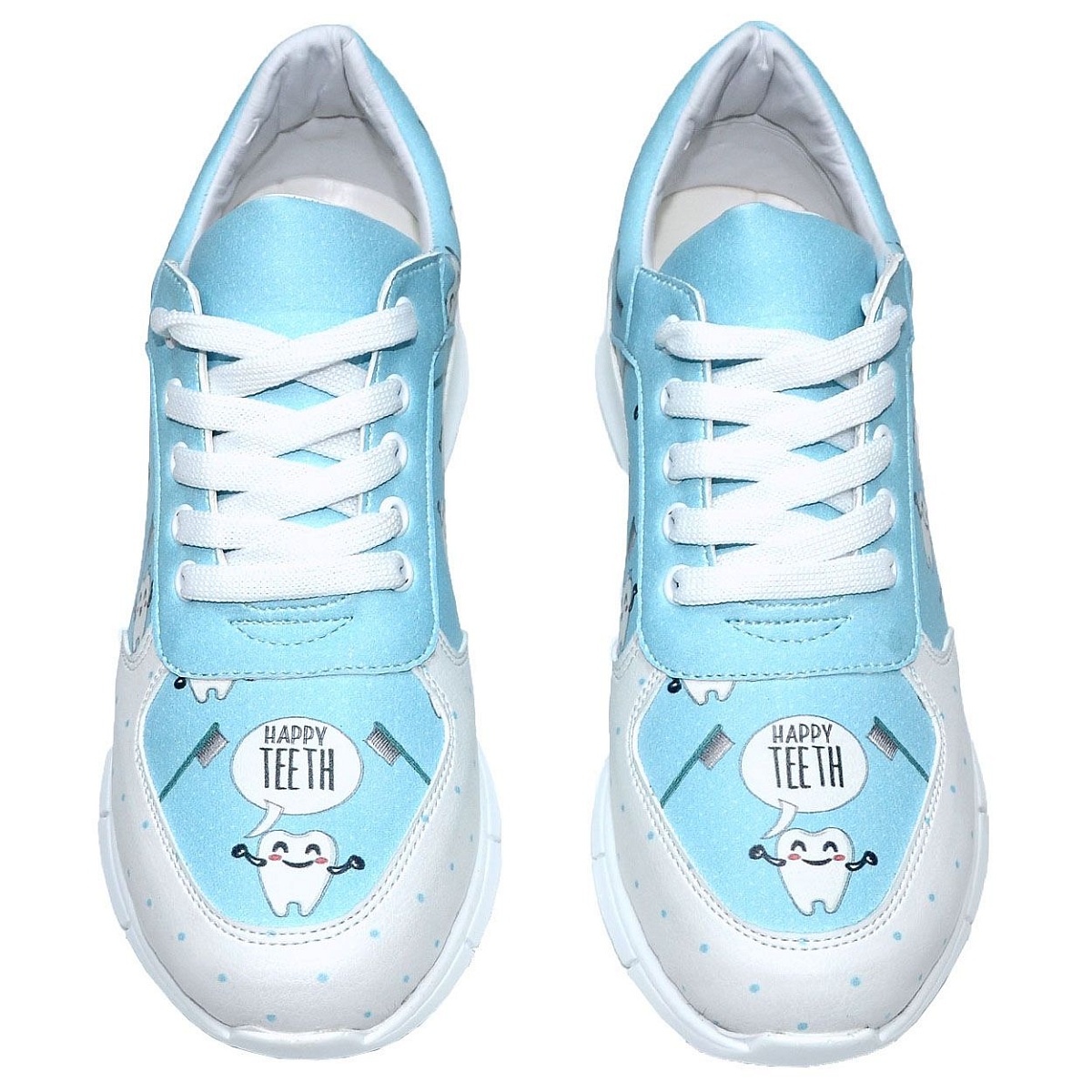 Легкие кроссовки классических медицинских цветов – белого и голубого. Идеально подойдут сотрудникам стоматологии – на них изображен улыбающийся зубик и зубные щетки. Такая обувь не только красива и современна, но и подходит для повседневной носки за счет высокого уровня комфорта.