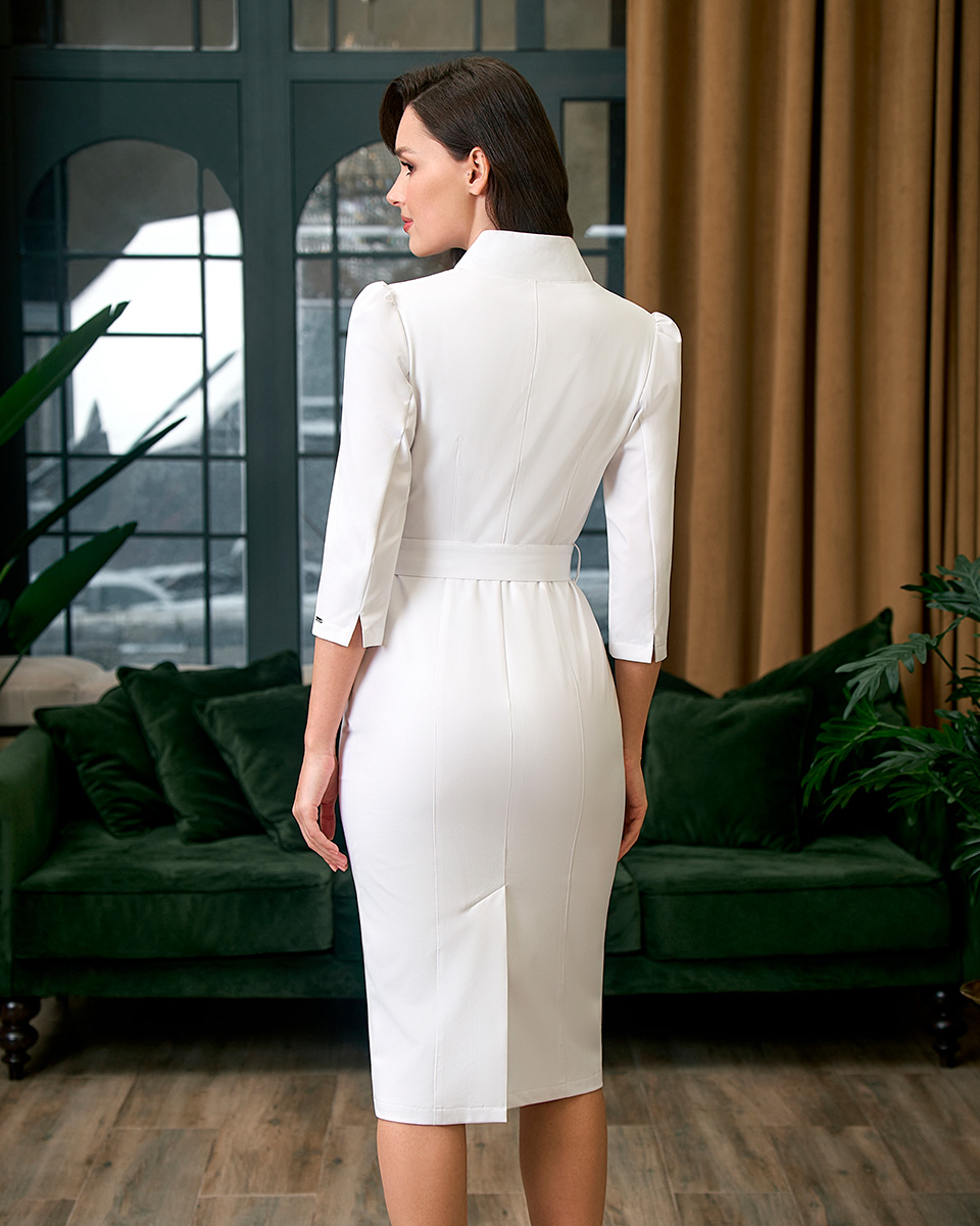 Воротник-стойка переходит в V-образный вырез, который вытягивает силуэт, а пояс с пряжкой подчеркивает линию талии.