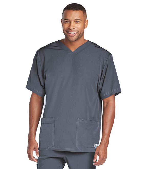 Практичный, очень легкий, хорошо тянущийся топ свободного кроя. Имеет комбинированные передние карманы с отстроченными секциями для фиксации инструментов; на плече – эластичная петля для бейджа. Карманы рассчитаны на размеры современных гаджетов. Стыки деталей оформлены рельефными швами, это придает модели элегантность и подчеркивает лаконичность дизайна. Ткань – прохладная, воздухопроницаемая, комфортная при касании. Специализирована для профессиональной одежды – гигиенична, не впитывает запахи, устойчива к загрязнениям, проста в уходе.