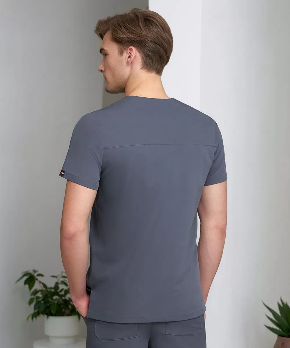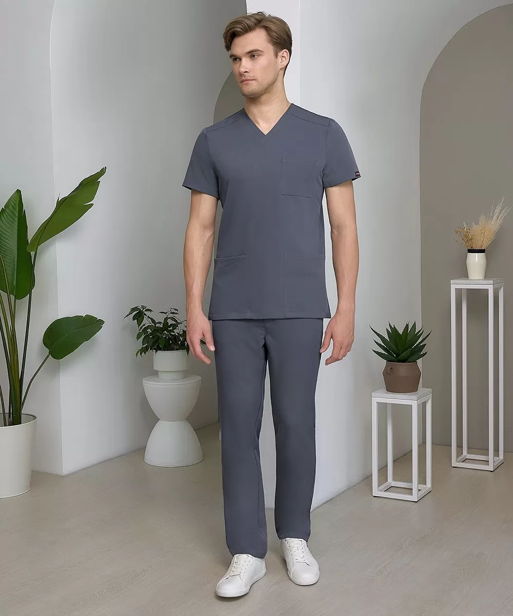 Короткие рукава футболочного типа, горизонтальная линии кокетки, два боковых и один нагрудный накладные карманы отражают концепцию лаконичности и практичности.
