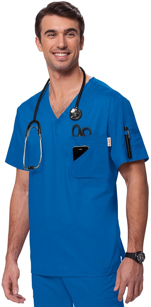 Мужской хлопковый топ классического фасона и оригинальной расцветки. Отличается необычным принтом и функциональным набором карманов. Топ имеет V-образный вырез горловины, короткий втачной рукав и вентиляционные разрезы внизу по бокам для лучшей посадки топа на бедрах. Нагрудный карман накладной, застегивается на липучку и имеет внешнюю секцию, которая как бы повторяет по форме основной карман, но со срезанным углом. Накладной карман на левом рукаве дополнен планкой для ручек и карандашей. Вместительные боковые карманы имеют дизайн «невидимок». Всего, включая маленькие дополнительные секции, топ имеет шесть карманов.
