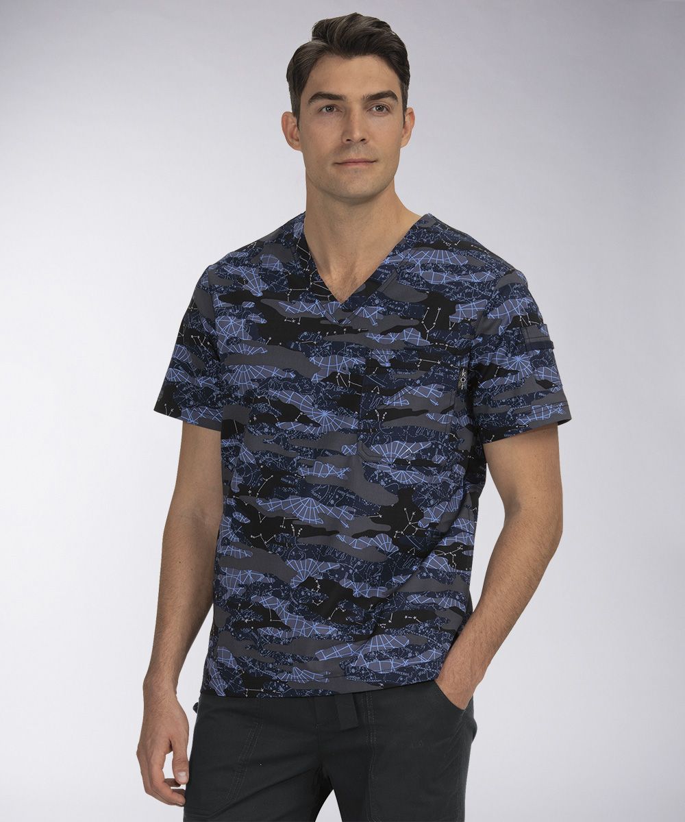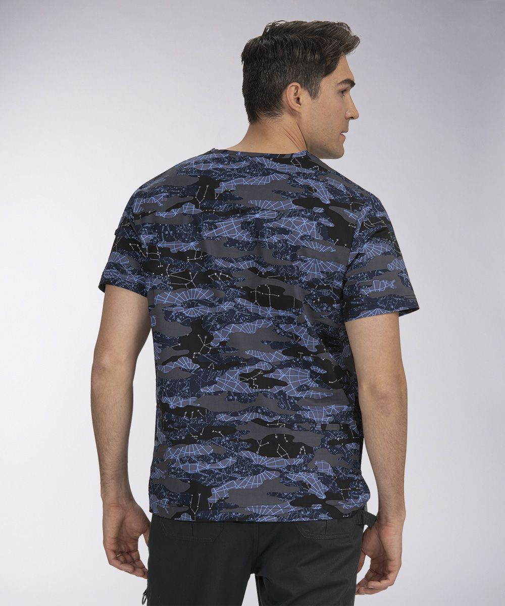Мужской хлопковый топ классического фасона и оригинальной расцветки. Отличается необычным принтом и функциональным набором карманов. Топ имеет V-образный вырез горловины, короткий втачной рукав и вентиляционные разрезы внизу по бокам для лучшей посадки топа на бедрах. Нагрудный карман накладной, застегивается на липучку и имеет внешнюю секцию, которая как бы повторяет по форме основной карман, но со срезанным углом. Накладной карман на левом рукаве дополнен планкой для ручек и карандашей. Вместительные боковые карманы имеют дизайн «невидимок». Всего, включая маленькие дополнительные секции, топ имеет шесть карманов.