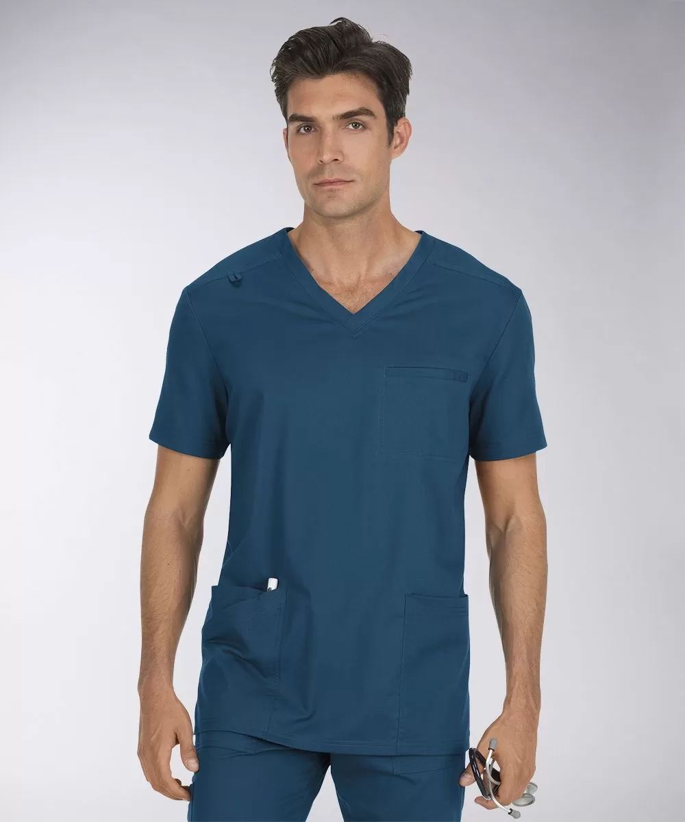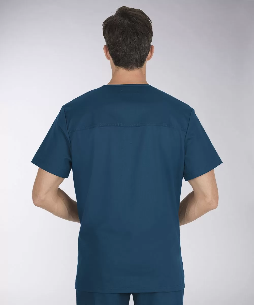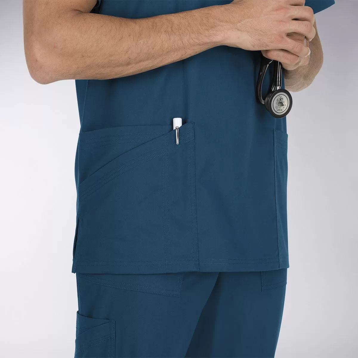 Улучшенная классика от КОИ. V-образная горловина, короткие рукава, боковые разрезы подола, передняя и задняя кокетка, функциональные карманы. Под передней кокеткой справа - петля для бейджа. Нагрудный карман прорезной, обстрочен по контуру. Накладные карманы по бокам крупные, вместительные, правый скошен в декоративных целях, дополнен внутренним отделением и отстроченной секцией под ручку.