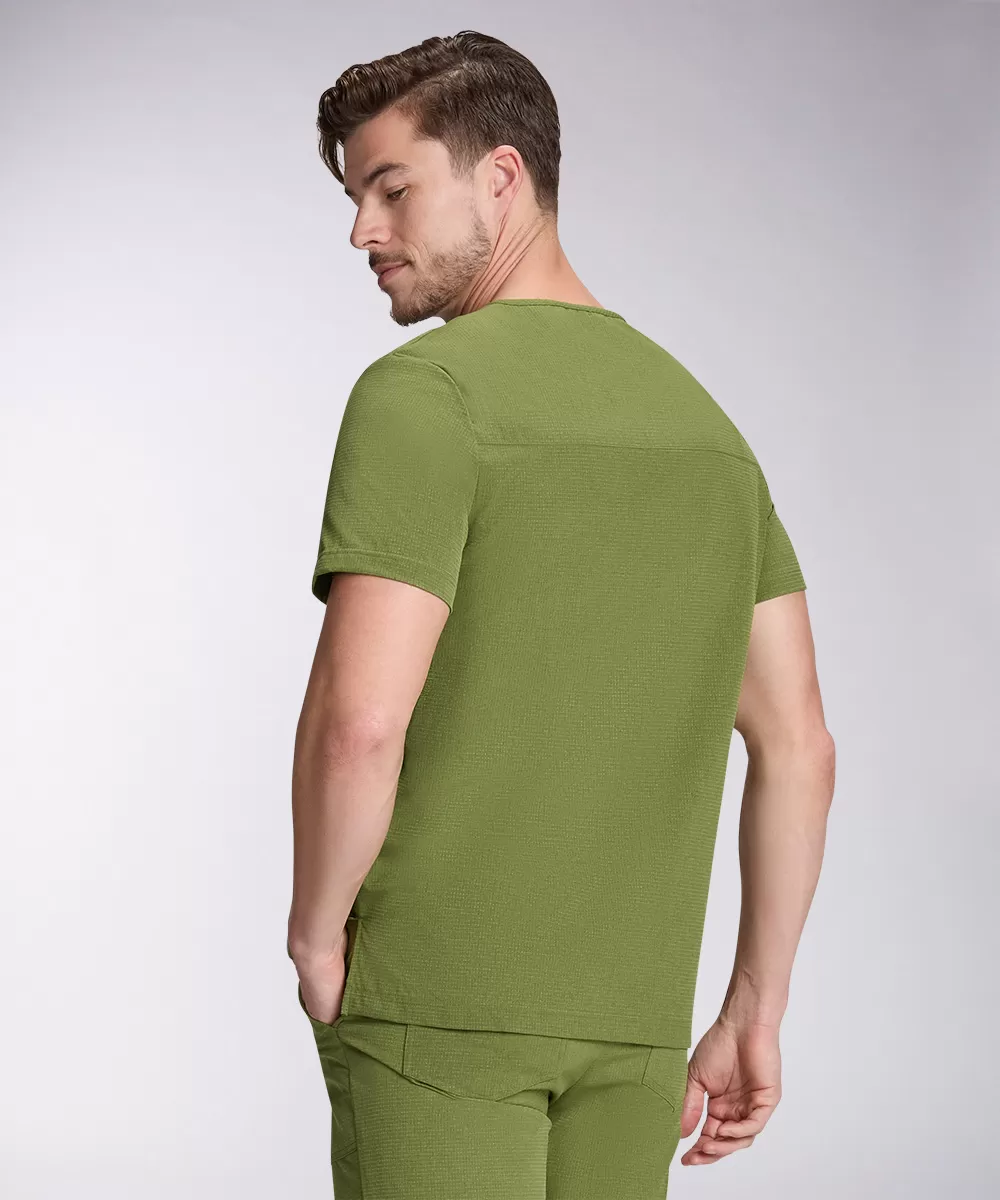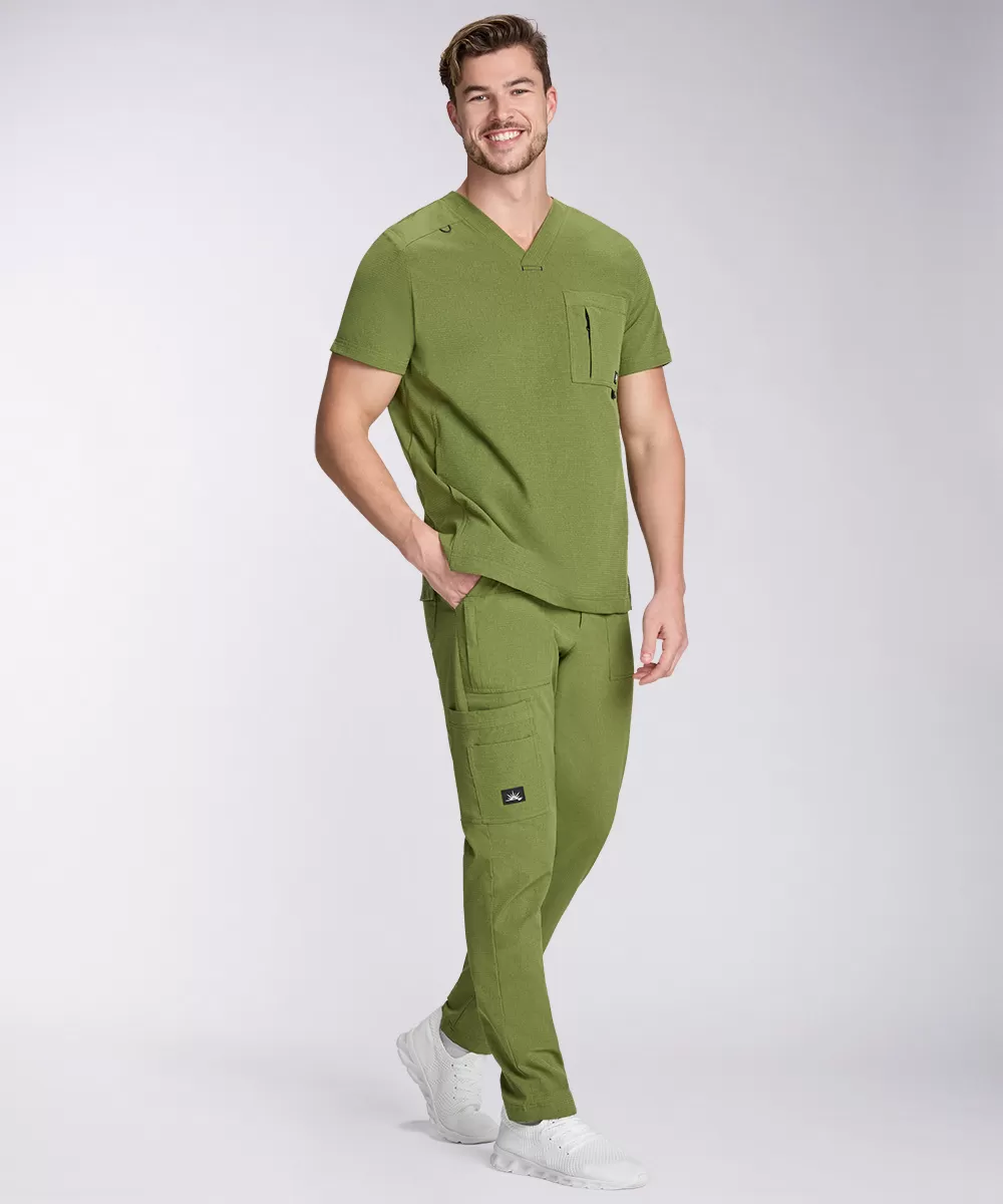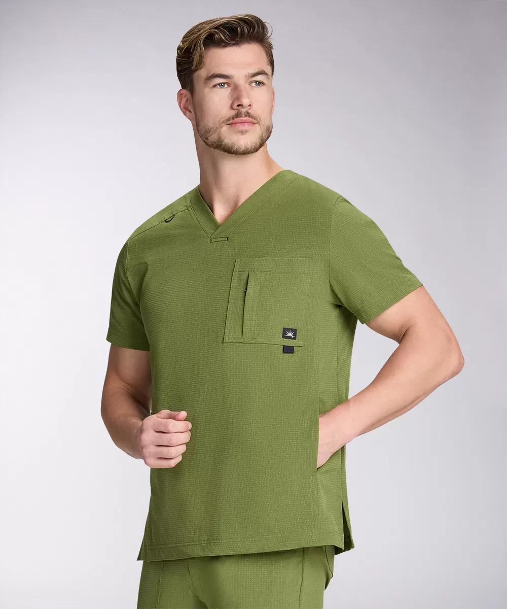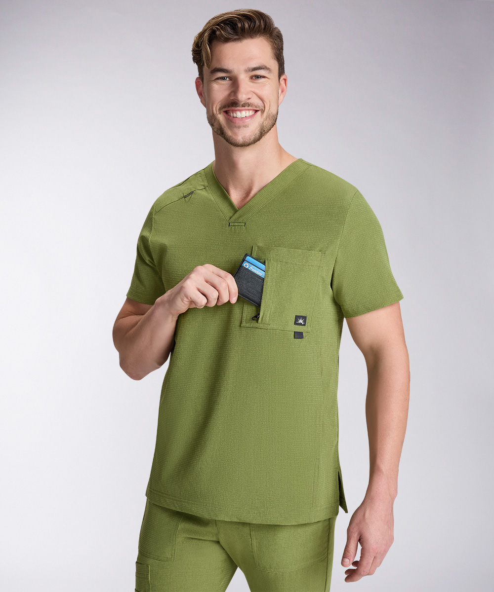 Универсальный мужской топ из коллекции Solis выполнен из прочной и мягкой ткани ExoFlex™️ ripstop сочетает стиль и функциональность. Модель с v-образным вырезом, двойным нагрудным карманом на молнии и боковыми карманами, а также контрастными деталями и петлей для удостоверения личности дополняется боковыми разрезами, придающими комфорт профессиональным движениям. Универсальный крой позволяет носить топ как в заправленном, так и в расстегнутом виде.