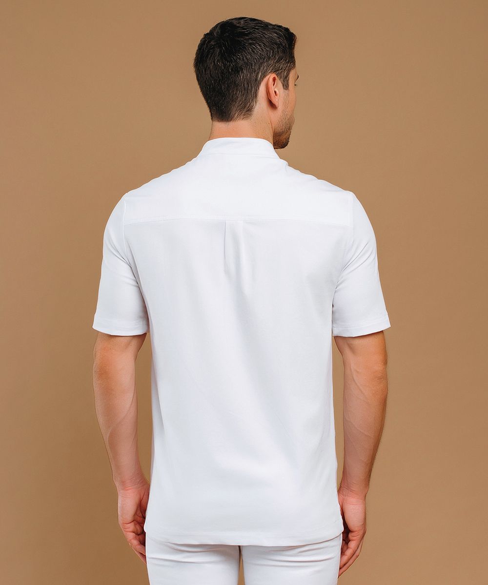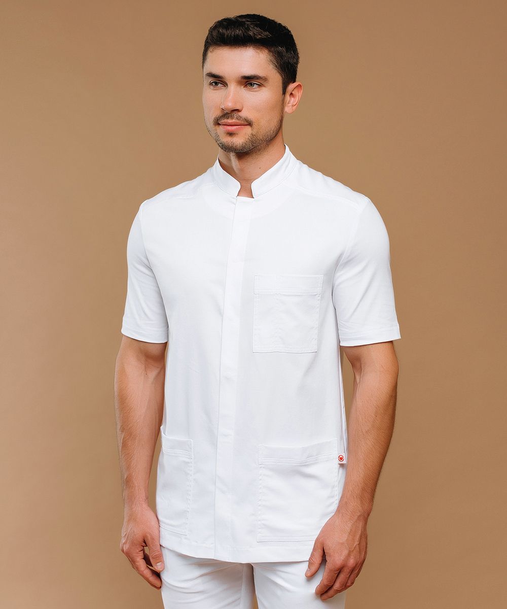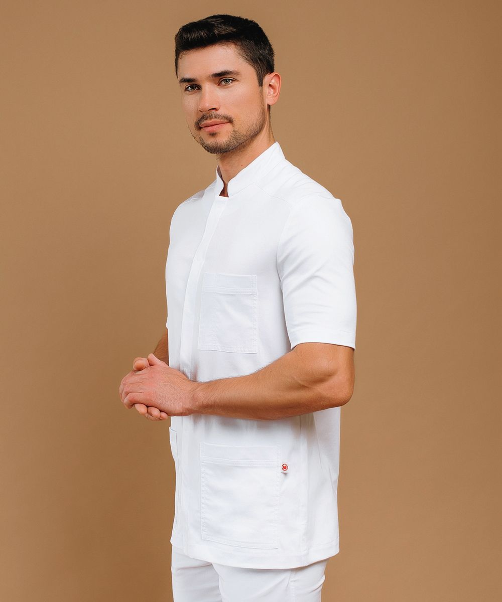 Жакет свободного кроя с аккуратным воротником-стойкой, образующим фигурную горловину, застежкой на потайных кнопках на графичной центральной планке и коротким рукавом футболочного типа.