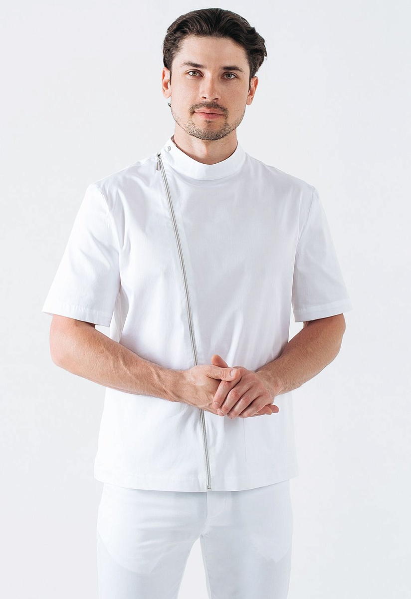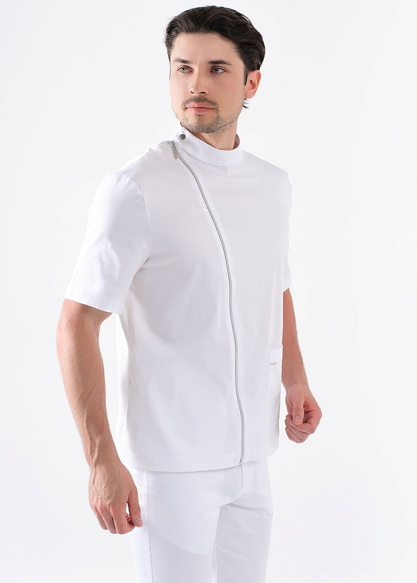 Прямой укороченный жакет-бомбер с асимметричной застежкой на молнии и воротником-стойкой на кнопке.