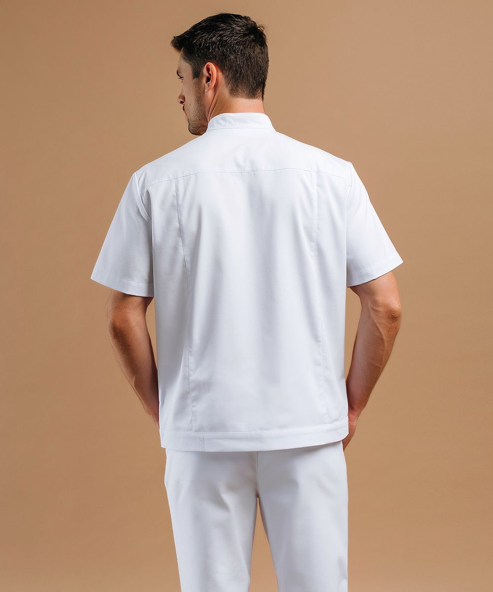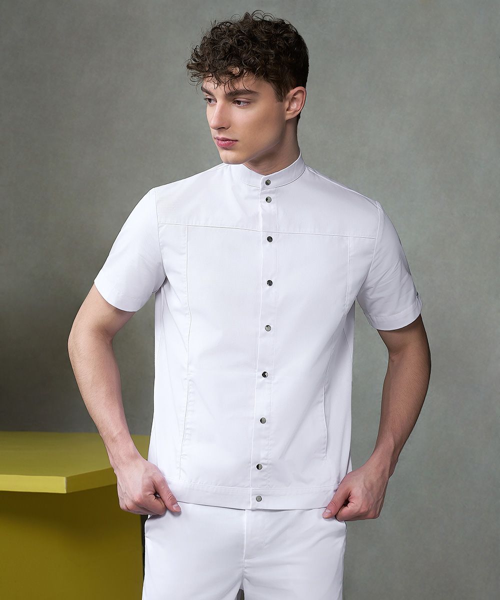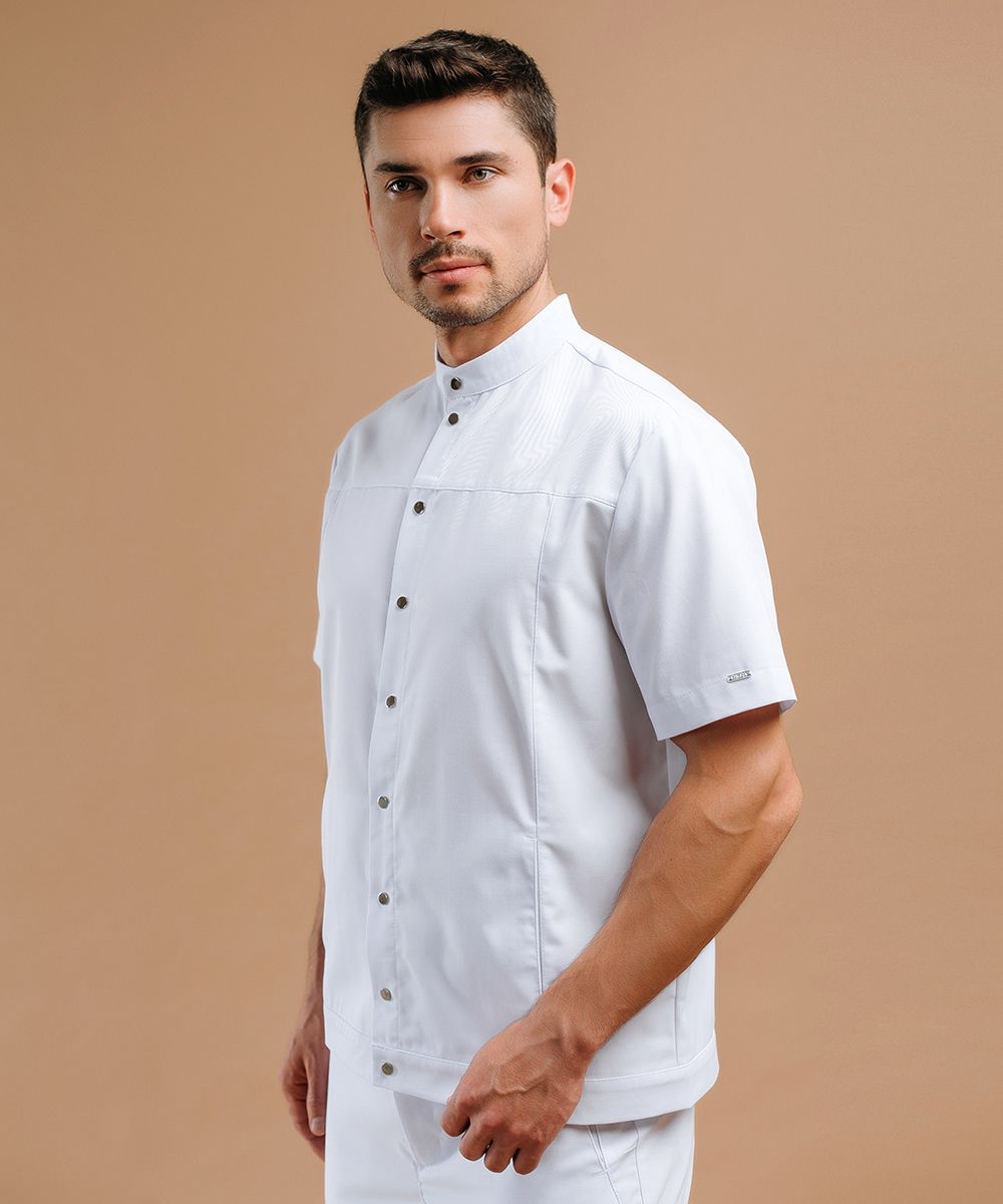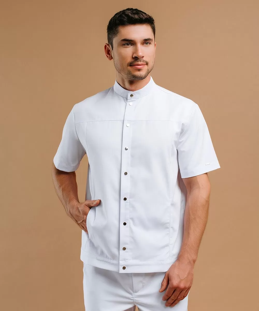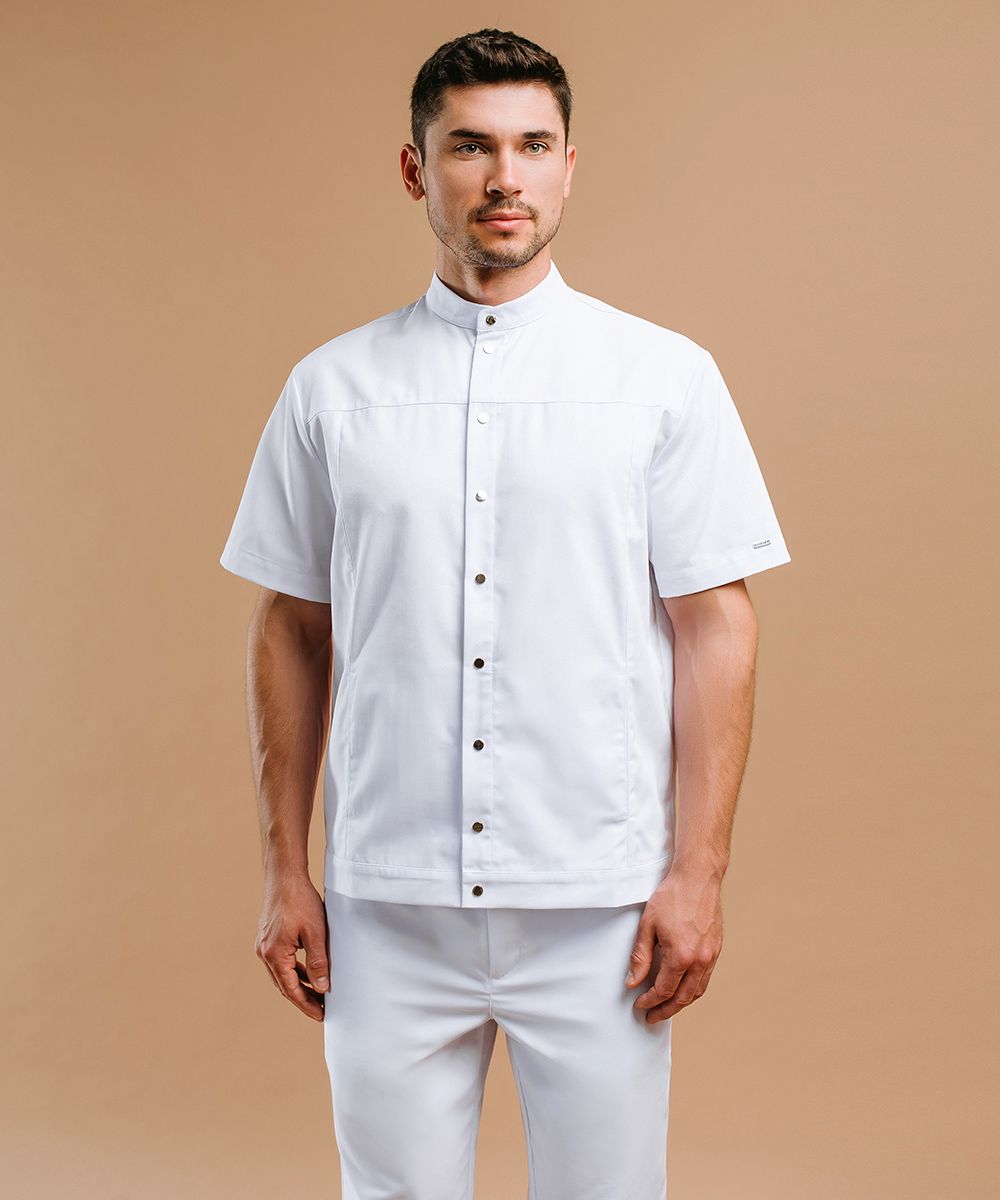 Удобный жакет с воротником-стойкой и центральной бортовой застежкой на 9 металлизированных кнопок с короткими втачными рукавами.